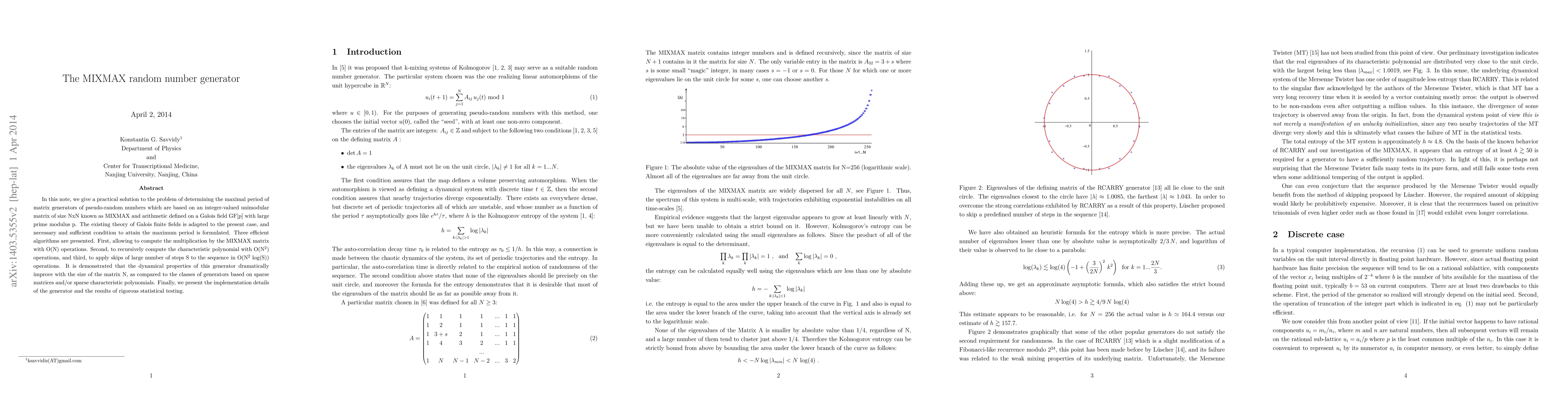 In this note, we give a practical solution to the problem of determining the maximal period of matrix generators of pseudo-random numbers which are based on an integer-valued unimodular matrix of size NxN known as MIXMAX and arithmetic defined on a Galois field GF[p] with large prime modulus p. The existing theory of Galois finite fields is adapted to the present case, and necessary and sufficient condition to attain the maximum period is formulated. Three efficient algorithms are presented. First, allowing to compute the multiplication by the MIXMAX matrix with O(N) operations. Second, to recursively compute the characteristic polynomial with O(N^2) operations, and third, to apply skips of large number of steps S to the sequence in O(N^2 log(S)) operations. It is demonstrated that the dynamical properties of this generator dramatically improve with the size of the matrix N, as compared to the classes of generators based on sparse matrices and/or sparse characteristic polynomials. Finally, we present the implementation details of the generator and the results of rigorous statistical testing.