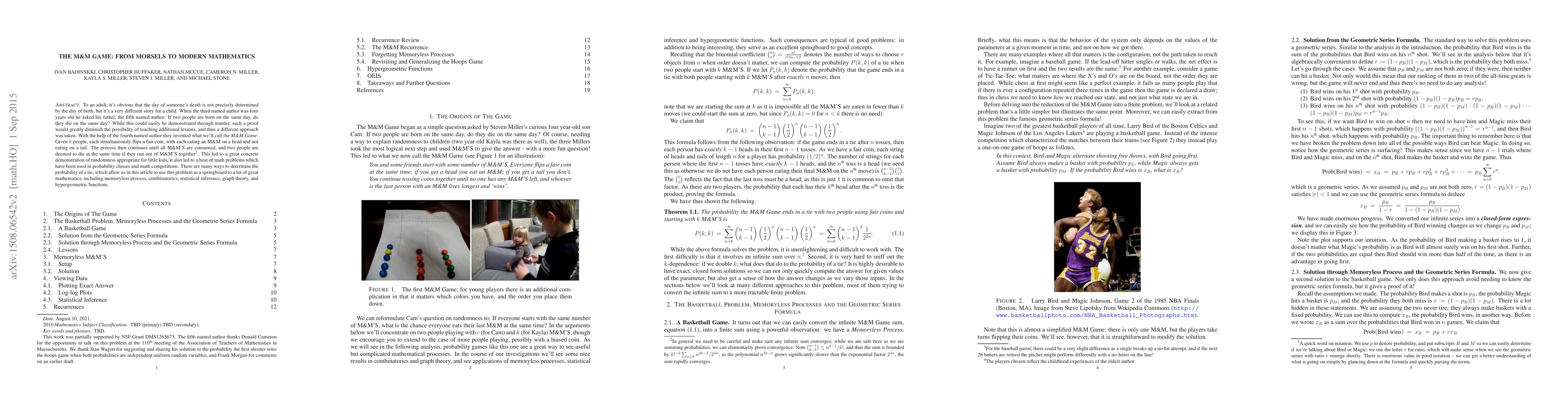To an adult, it's obvious that the day of someone's death is not precisely determined by the day of birth, but it's a very different story for a child. When the third named author was four years old he asked his father, the fifth named author: If two people are born on the same day, do they die on the same day? While this could easily be demonstrated through murder, such a proof would greatly diminish the possibility of teaching additional lessons, and thus a different approach was taken. With the help of the fourth named author they invented what we'll call \emph{the M\&M Game}: Given $k$ people, each simultaneously flips a fair coin, with each eating an M\&M on a head and not eating on a tail. The process then continues until all \mandms\ are consumed, and two people are deemed to die at the same time if they run out of \mandms\ together\footnote{Is one really living without \mandms?}. This led to a great concrete demonstration of randomness appropriate for little kids; it also led to a host of math problems which have been used in probability classes and math competitions. There are many ways to determine the probability of a tie, which allow us in this article to use this problem as a springboard to a lot of great mathematics, including memoryless process, combinatorics, statistical inference, graph theory, and hypergeometric functions.