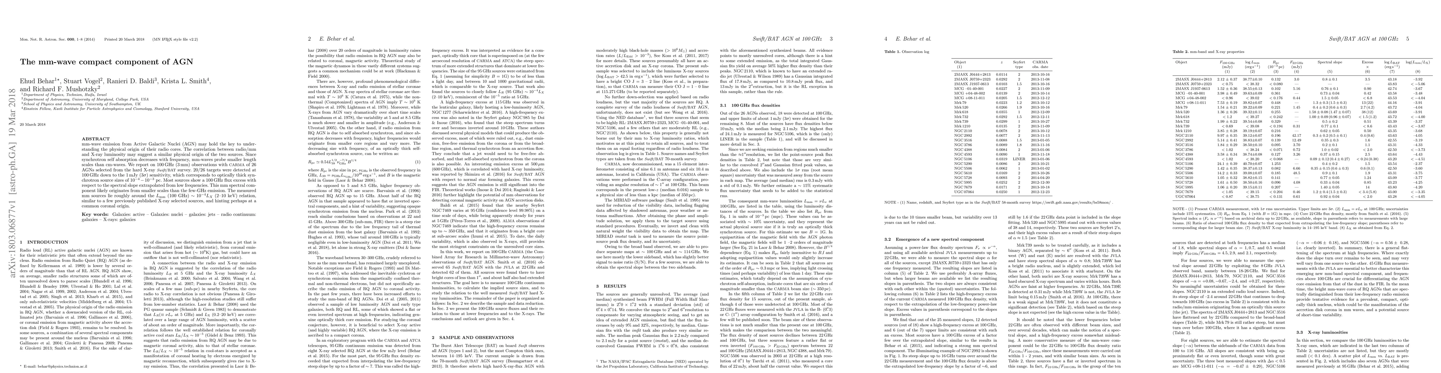 mm-wave emission from Active Galactic Nuclei (AGN) may hold the key to understanding the physical origin of their radio cores. The correlation between radio/mm and X-ray luminosity may suggest a similar physical origin of the two sources. Since synchrotron self absorption decreases with frequency, mm-waves probe smaller length scales than cm-waves. We report on 100 GHz (3 mm) observations with CARMA of 26 AGNs selected from the hard X-ray Swift/BAT survey. 20/26 targets were detected at 100 GHz down to the 1 mJy (3 $\sigma$) sensitivity, which corresponds to optically thick synchrotron source sizes of 10$^{-4}$ - 10$^{-3}$ pc). Most sources show a 100 GHz flux excess with respect to the spectral slope extrapolated from low frequencies. This mm spectral component likely originates from smaller scales than the few-GHz emission. The measured mm sources lie roughly around the L$_{mm}$ (100 GHz) $\sim$ 10$^{-1}$ L$_{X}$ (2-10 keV) relation, similar to a few previously published X-ray selected sources, and hinting perhaps at a common coronal origin.