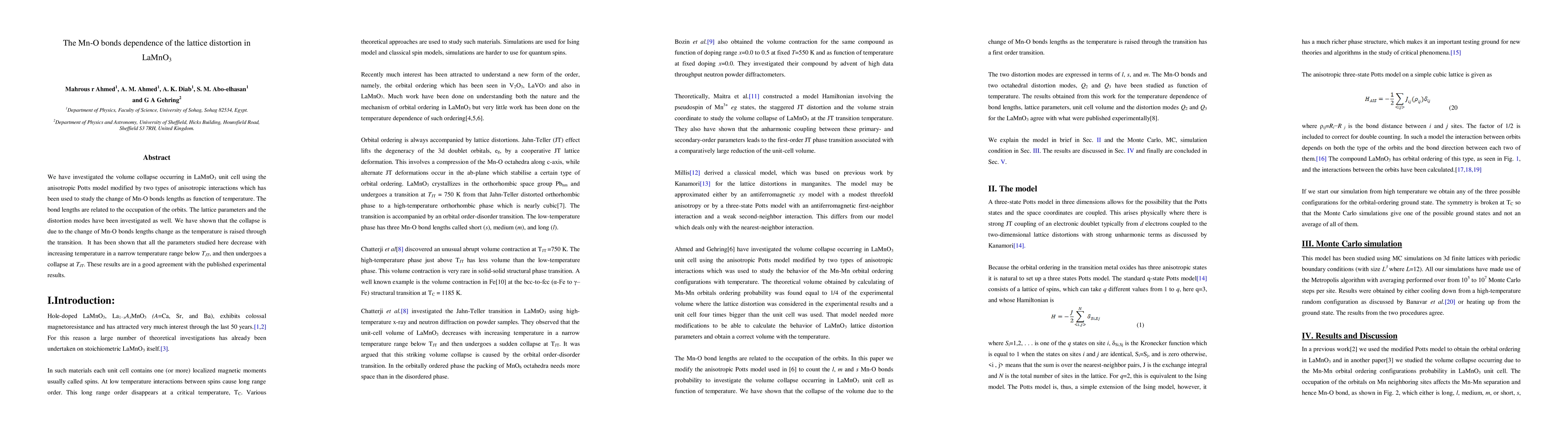We have investigated the volume collapse occurring in LaMnO3 unit cell using the anisotropic Potts model modified by two types of anisotropic interactions which has been used to study the change of Mn-O bonds lengths as function of temperature. The bond lengths are related to the occupation of the orbits. The lattice parameters and the distortion modes have been investigated as well. We have shown that the collapse is due to the change of Mn-O bonds lengths change as the temperature is raised through the transition. It has been shown that all the parameters studied here decrease with increasing temperature in a narrow temperature range below TJT, and then undergoes a collapse at TJT. These results are in a good agreement with the published experimental results.