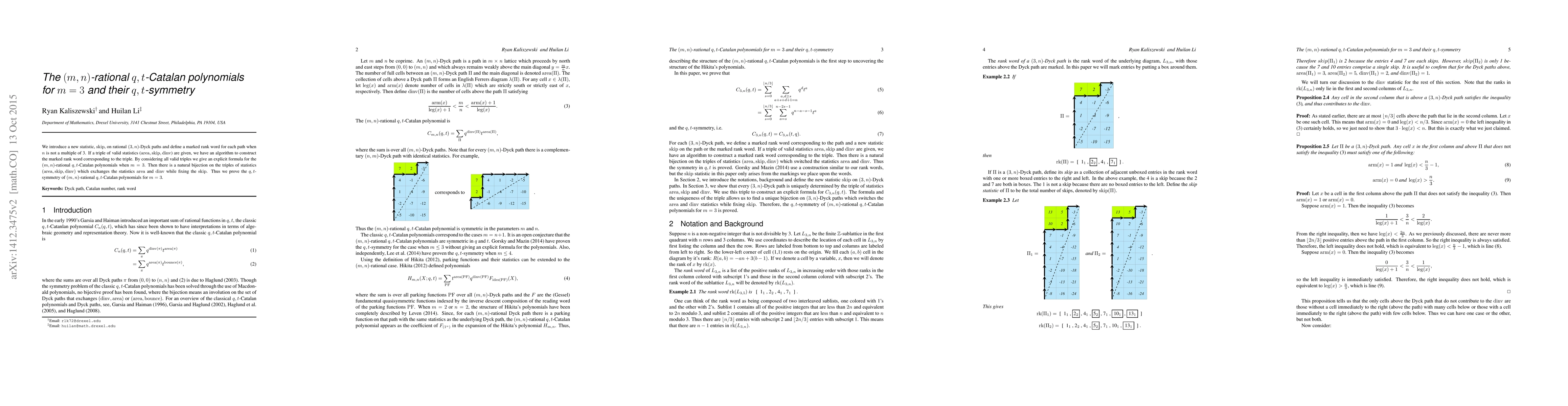 The paper introduces new combinatorial tools to explicitly compute certain rational Catalan polynomials when m=3 and proves a symmetry property of these polynomials related to swapping two key statistics. This advances understanding of the structure and symmetry in these mathematical objects.
