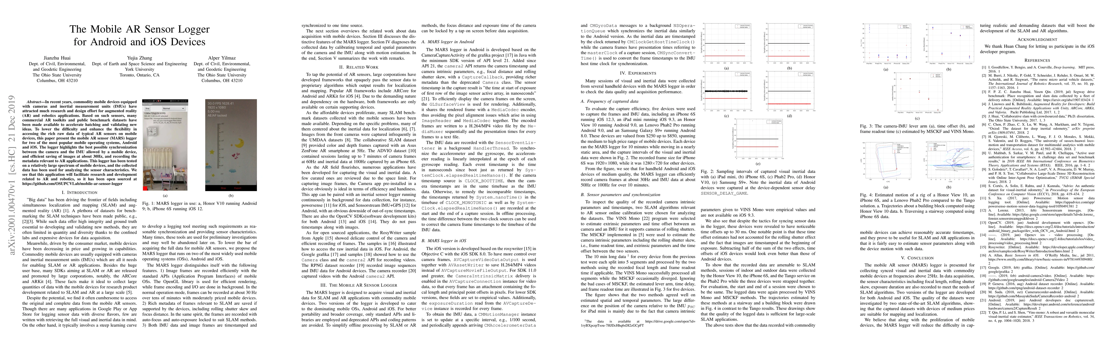 This paper presents the MARS logger, a tool for capturing synchronized camera and IMU data from mobile devices on Android and iOS, facilitating AR and robotics research. The logger efficiently records images and metadata, and has been tested across various devices to analyze sensor characteristics.