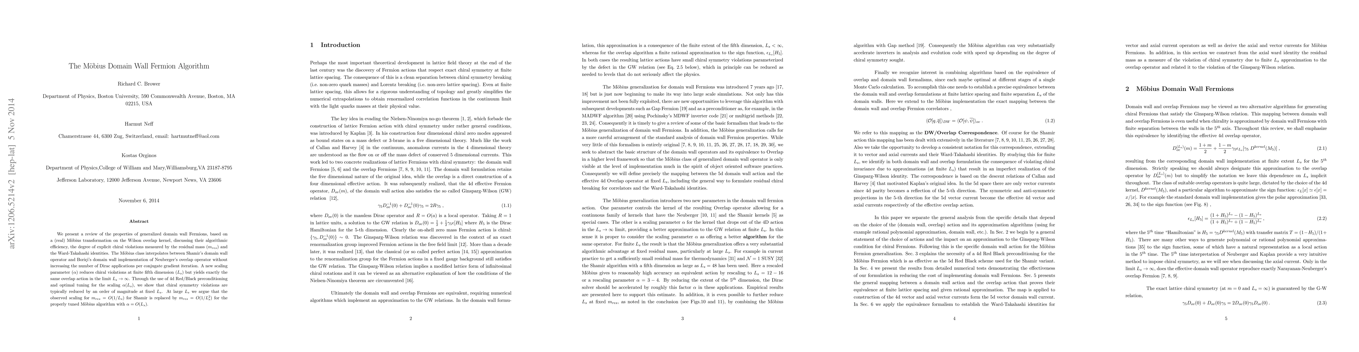 This paper reviews the M\"obius domain wall fermion algorithm, highlighting its efficiency and reduced chiral violations through a new scaling parameter. It demonstrates significant improvements in symmetry violations and residual mass scaling compared to Shamir's domain wall operator.