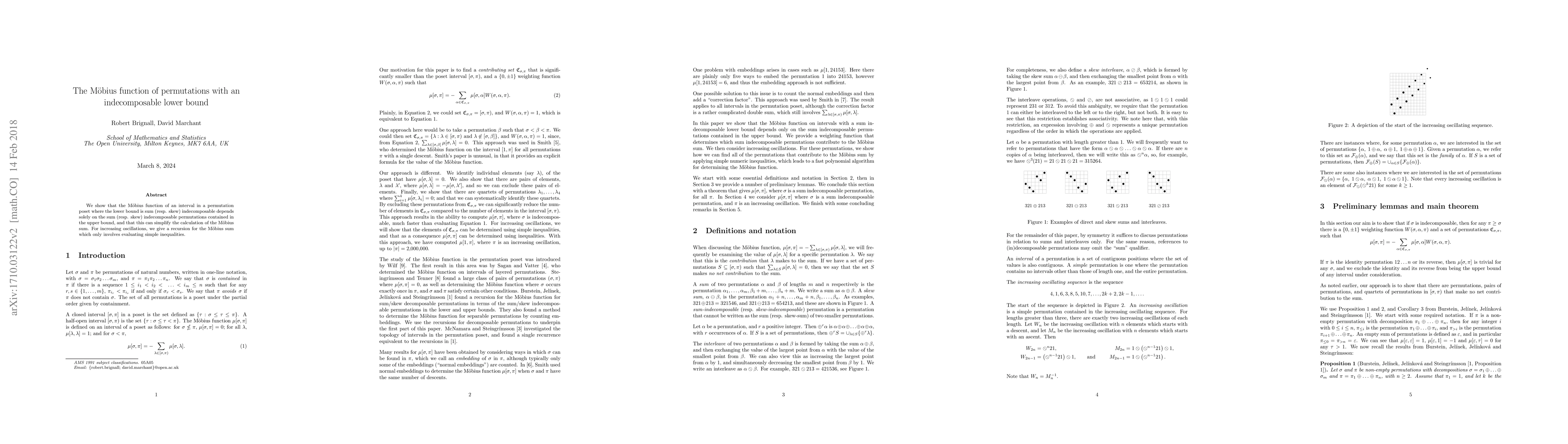 We show that the M\"obius function of an interval in a permutation poset where the lower bound is sum (resp. skew) indecomposable depends solely on the sum (resp. skew) indecomposable permutations contained in the upper bound, and that this can simplify the calculation of the M\"obius sum. For increasing oscillations, we give a recursion for the M\"obius sum which only involves evaluating simple inequalities.