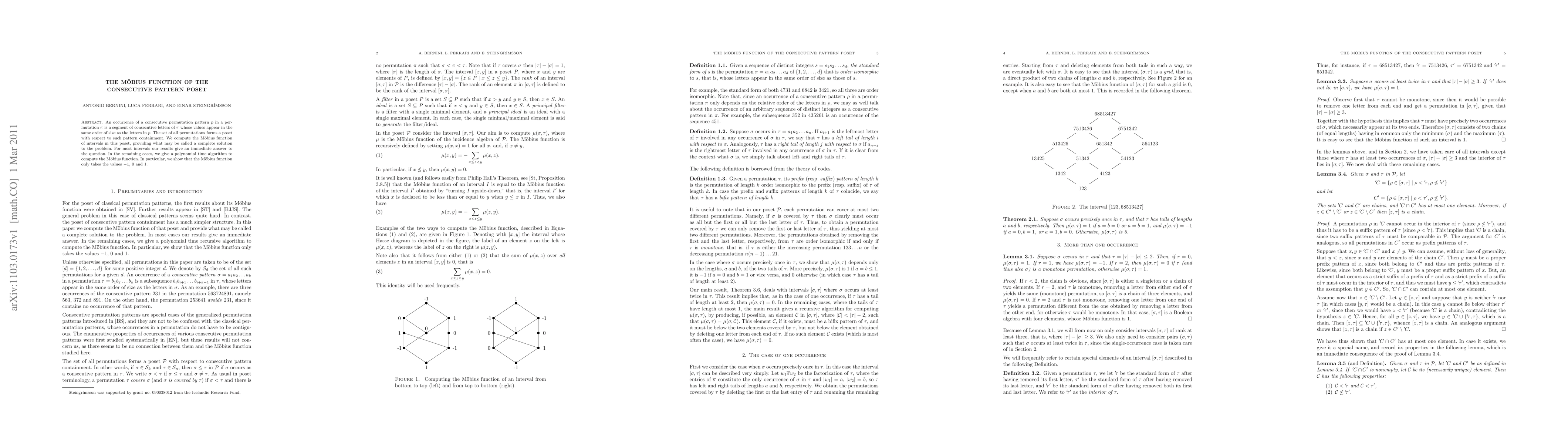 This paper computes the M\"obius function for intervals in the poset formed by consecutive permutation patterns, providing a complete solution for most cases and a polynomial time algorithm for others. It demonstrates that the M\"obius function in this context only assumes the values -1, 0, or 1.