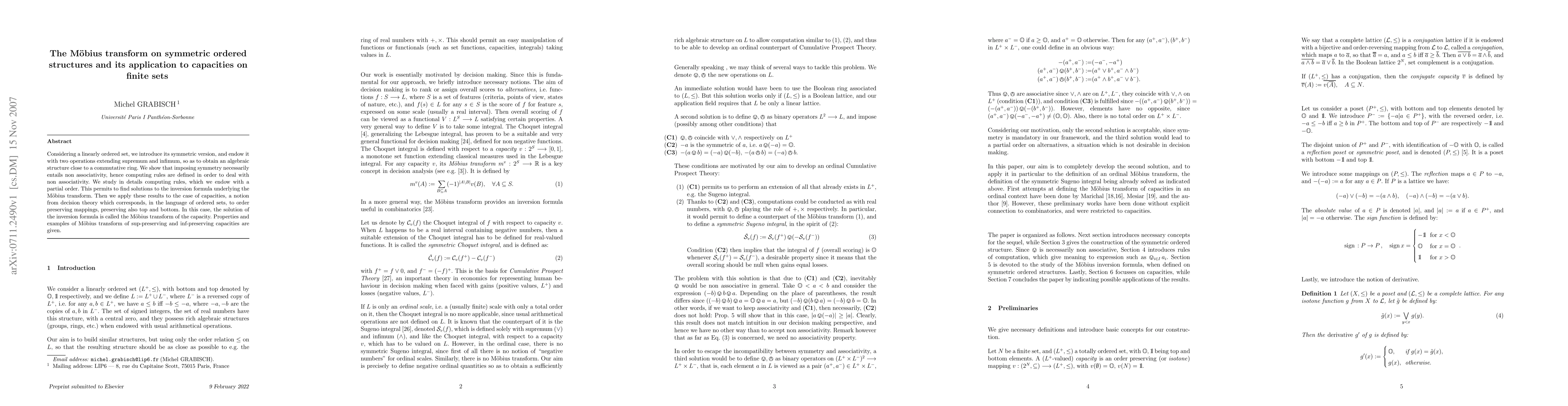 Considering a linearly ordered set, we introduce its symmetric version, and endow it with two operations extending supremum and infimum, so as to obtain an algebraic structure close to a commutative ring. We show that imposing symmetry necessarily entails non associativity, hence computing rules are defined in order to deal with non associativity. We study in details computing rules, which we endow with a partial order. This permits to find solutions to the inversion formula underlying the M\"obius transform. Then we apply these results to the case of capacities, a notion from decision theory which corresponds, in the language of ordered sets, to order preserving mappings, preserving also top and bottom. In this case, the solution of the inversion formula is called the M\"obius transform of the capacity. Properties and examples of M\"obius transform of sup-preserving and inf-preserving capacities are given.