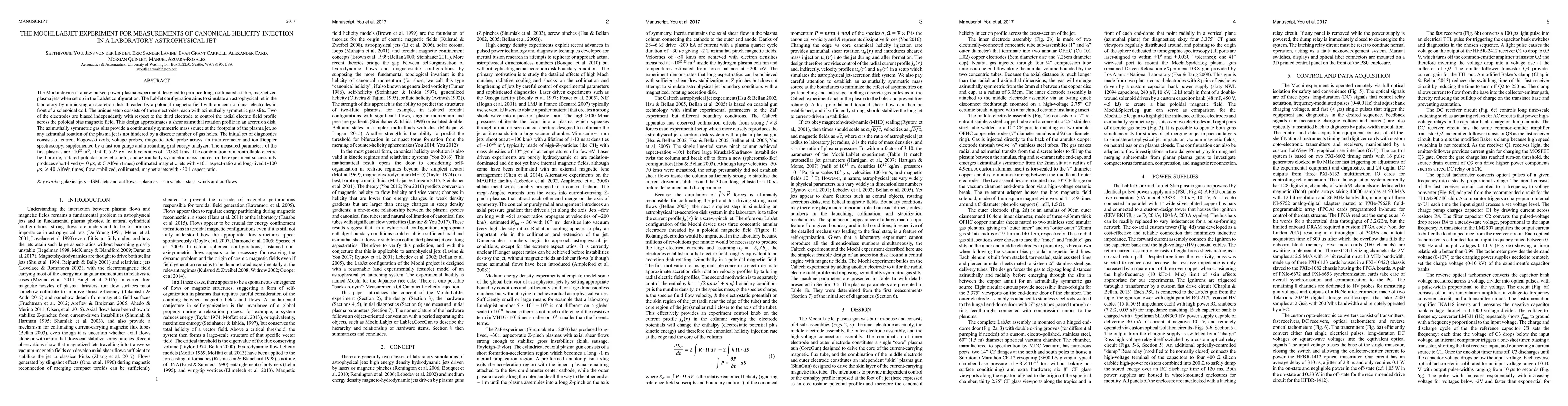 The Mochi device is a new pulsed power plasma experiment designed to produce long, collimated, stable, magnetized plasma jets when set up in the LabJet configuration. The LabJet configuration aims to simulate an astrophysical jet in the laboratory by mimicking an accretion disk threaded by a poloidal magnetic field with concentric planar electrodes in front of a solenoidal coil. The unique setup consists of three electrodes, each with azimuthally symmetric gas slits. Two of the electrodes are biased independently with respect to the third electrode to control the radial electric field profile across the poloidal bias magnetic field. This design approximates a shear azimuthal rotation profile in an accretion disk. The azimuthally symmetric gas slits provide a continuously symmetric mass source at the footpoint of the plasma jet, so any azimuthal rotation of the plasma jet is not hindered by a discrete number of gas holes. The initial set of diagnostics consists of current Rogowski coils, voltage probes, magnetic field probe arrays, an interferometer and ion Doppler spectroscopy, supplemented by a fast ion gauge and a retarding grid energy analyzer. The measured parameters of the first plasmas are 1E22 m-3, 0.4 T, 5-25 eV, with velocities of 20-80 km/s. The combination of a controllable electric field profile, a flared poloidal magnetic field, and azimuthally symmetric mass sources in the experiment successfully produces short-lived (10 {\mu}s, >5 Alfv\'en times) collimated magnetic jets with ~10:1 aspect-ratio and long-lived (100 {\mu}s, >40 Alfv\'en times) flow-stabilized, collimated, magnetic jets with ~30:1 aspect-ratio.
