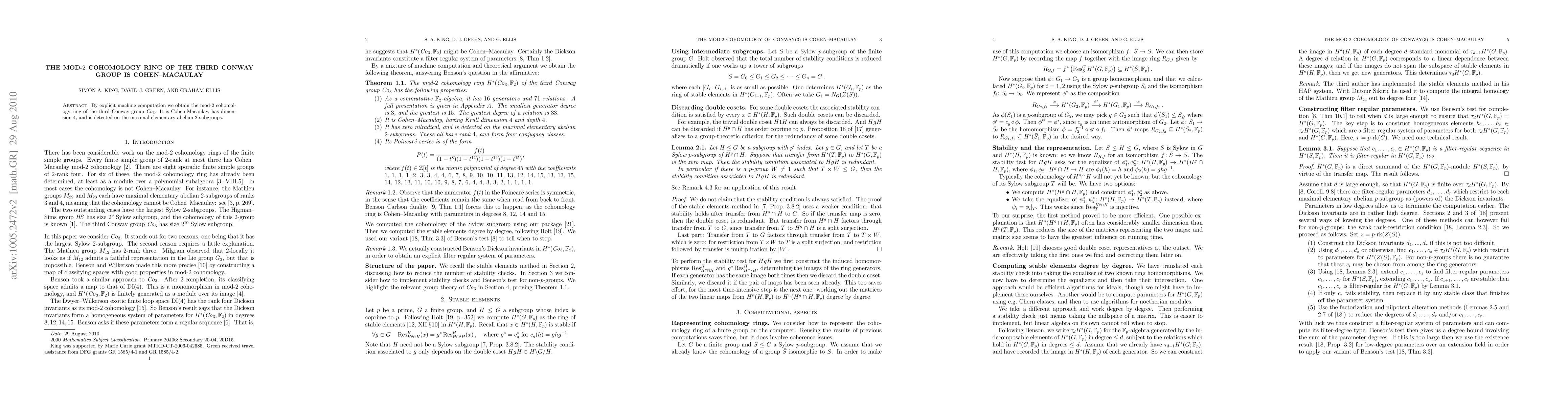 The mod-2 cohomology ring of the third Conway group Co_3 is identified as Cohen-Macaulay through computational methods, with a dimension of 4 and detected on maximal elementary abelian 2-subgroups.