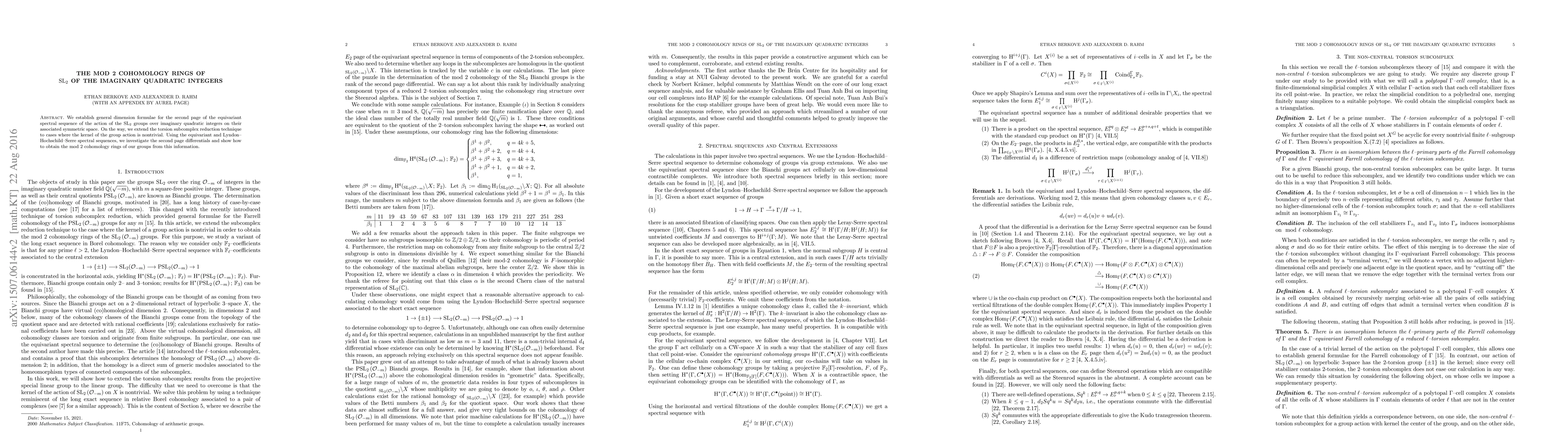 This paper establishes dimension formulae for the second page of the equivariant spectral sequence of SL₂ groups acting on symmetric spaces over imaginary quadratic integers. It extends the torsion subcomplex reduction technique and uses equivariant and Lyndon-Hochschild-Serre spectral sequences to determine the mod 2 cohomology rings of these groups.