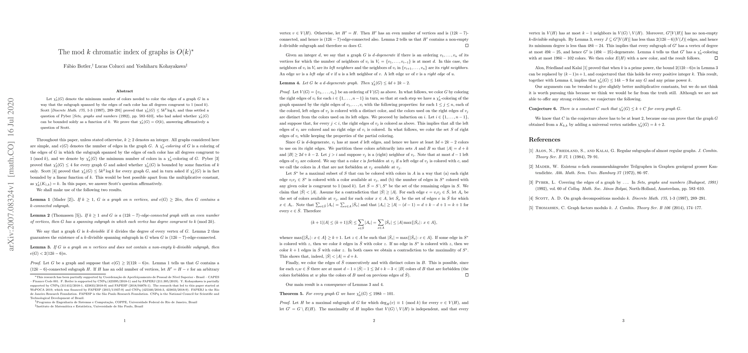 The paper establishes a new upper bound for the mod $k$ chromatic index of graphs, utilizing lemmas on graph connectivity and degeneracy to prove $\chi'_k(G) = O(k)$.