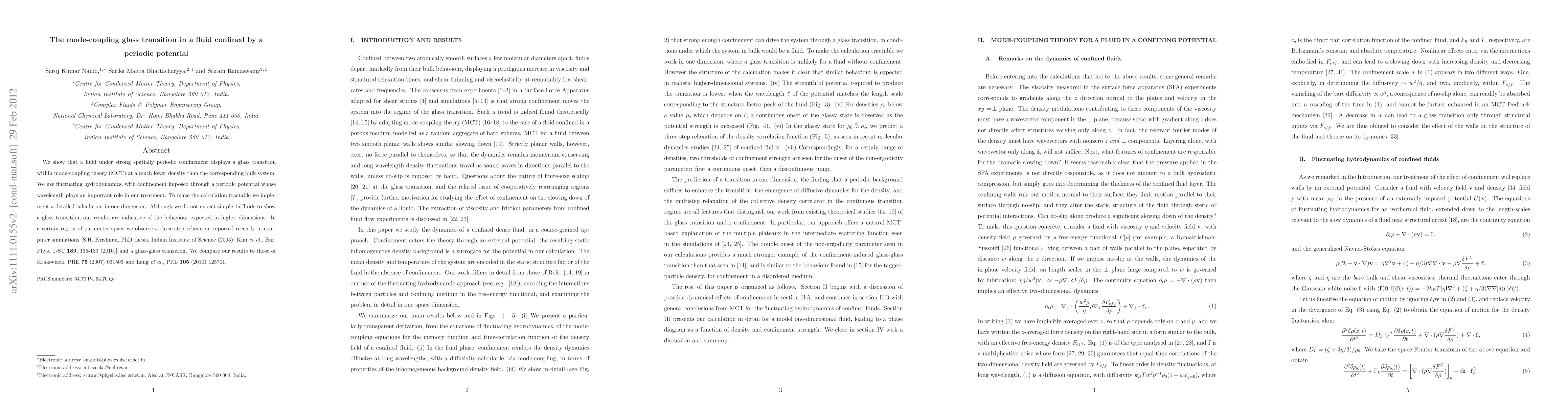 This study demonstrates that a fluid confined by a periodic potential exhibits a glass transition at a lower density than its bulk counterpart, as predicted by mode-coupling theory. The research employs fluctuating hydrodynamics and a one-dimensional approach to elucidate the behavior expected in higher dimensions, revealing a three-step relaxation and a glass-glass transition.