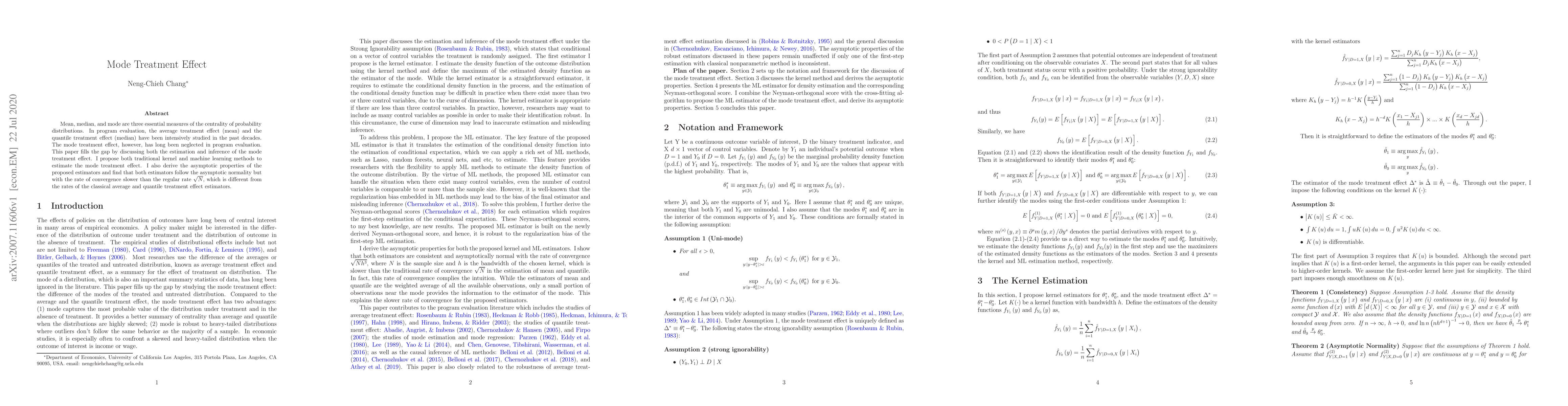 This paper introduces the concept of the mode treatment effect in program evaluation, proposing traditional kernel and machine learning methods for its estimation. It finds that the proposed estimators exhibit asymptotic normality but converge at a slower rate than the average and quantile treatment effect estimators.