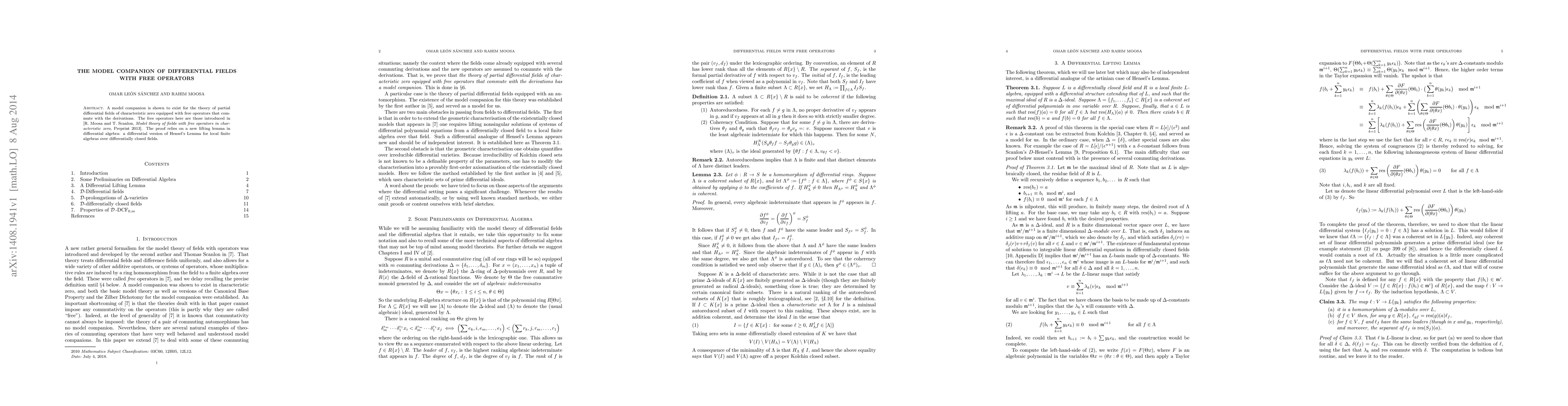 This paper establishes a model companion for the theory of differential fields with free operators that commute with derivations. The proof utilizes a novel lifting lemma in differential algebra, akin to a differential version of Hensel's Lemma for local finite algebras over differentially closed fields.