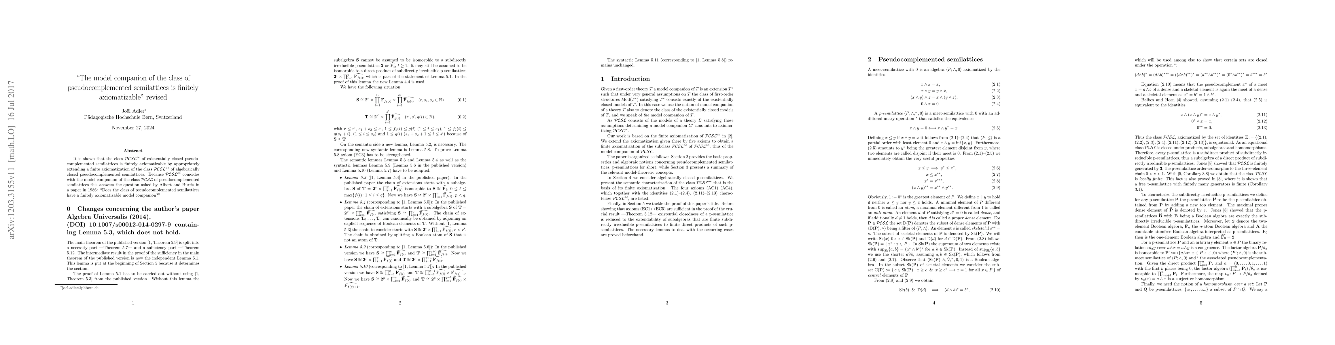 In this paper it is shown that the class $\mathcal{PCSL}^{ec}$ of existentially closed pseudocomplemented semilattices is finitely axiomatizable by appropriately extending the finite axiomatization of the class $\mathcal{\mathcal{PCSL}}^{ac}$ of algebraically closed pseudocomplemented semilattices presented in Rupp, Addler, and Schmid. Because $\mathcal{PCSL}^{ec}$ coincides with the model companion of the class $\mathcal{PCSL}$ of pseudocomplemented semilattices this addendum to Rupp, Addler, and Schmid solves the problem posed by Albert and Burris in the final paragraph of their paper: "Does the class of pseudocomplemented semilattices have a finitely axiomatizable model companion?"