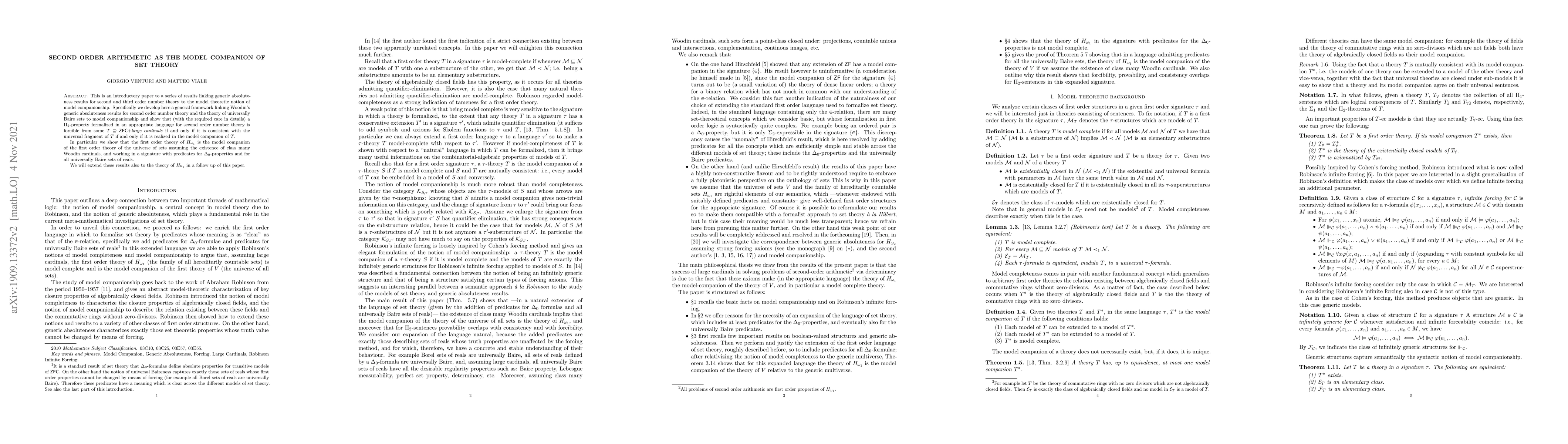 This paper establishes a connection between generic absoluteness results in second-order number theory and model companionship, showing that $\Pi_2$ properties are forcible from certain extensions of ZFC if and only if they are realized in the model companion of the theory. It demonstrates that the first-order theory of $H_{\omega_1}$ serves as the model companion under the assumption of class many Woodin cardinals.