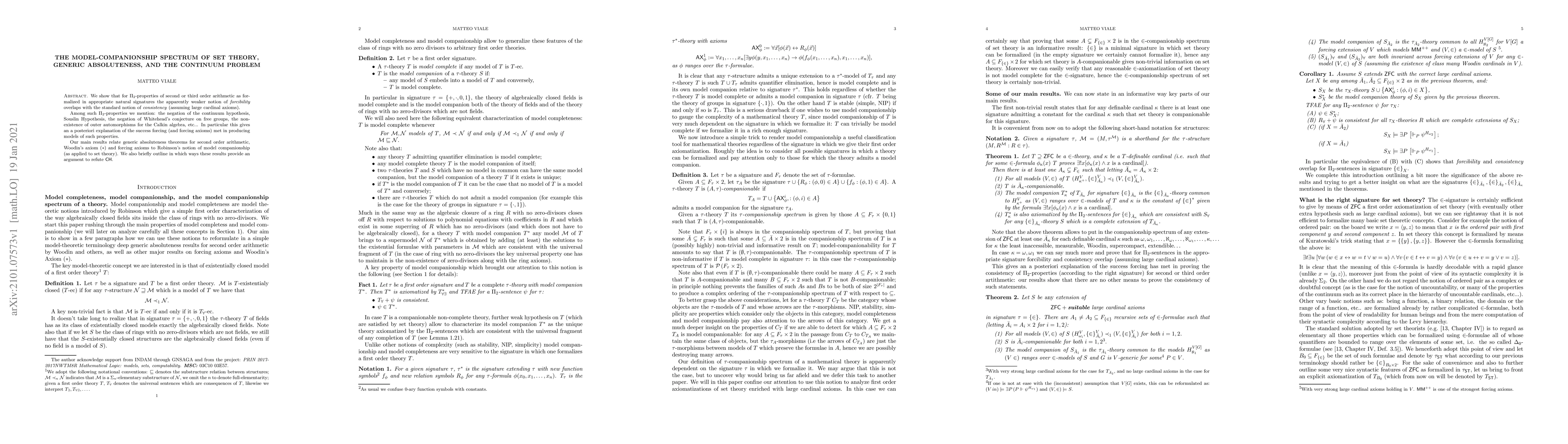 We show that for $\Pi_2$-properties of second or third order arithmetic as formalized in appropriate natural signatures the apparently weaker notion of forcibility overlaps with the standard notion of consistency (assuming large cardinal axioms). Among such $\Pi_2$-properties we mention: the negation of the Continuum hypothesis, Souslin Hypothesis, the negation of Whitehead's conjecture on free groups, the non-existence of outer automorphisms for the Calkin algebra, etc... In particular this gives an a posteriori explanation of the success forcing (and forcing axioms) met in producing models of such properties. Our main results relate generic absoluteness theorems for second order arithmetic, Woodin's axiom $(*)$ and forcing axioms to Robinson's notion of model companionship (as applied to set theory). We also briefly outline in which ways these results provide an argument to refute the Continuum hypothesis.