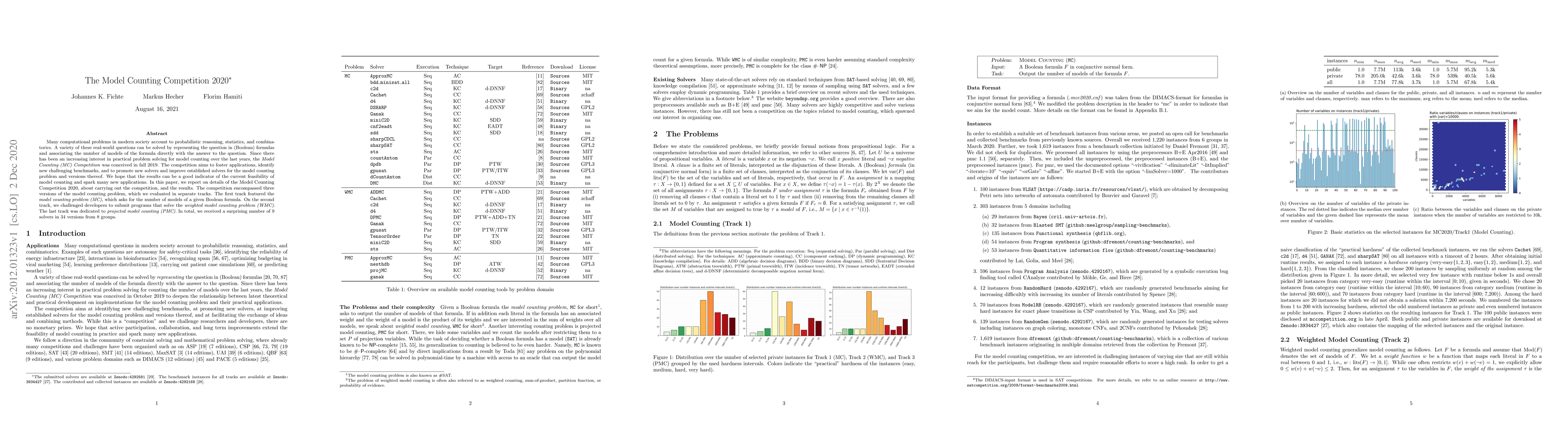 Many computational problems in modern society account to probabilistic reasoning, statistics, and combinatorics. A variety of these real-world questions can be solved by representing the question in (Boolean) formulas and associating the number of models of the formula directly with the answer to the question. Since there has been an increasing interest in practical problem solving for model counting over the last years, the Model Counting (MC) Competition was conceived in fall 2019. The competition aims to foster applications, identify new challenging benchmarks, and to promote new solvers and improve established solvers for the model counting problem and versions thereof. We hope that the results can be a good indicator of the current feasibility of model counting and spark many new applications. In this paper, we report on details of the Model Counting Competition 2020, about carrying out the competition, and the results. The competition encompassed three versions of the model counting problem, which we evaluated in separate tracks. The first track featured the model counting problem (MC), which asks for the number of models of a given Boolean formula. On the second track, we challenged developers to submit programs that solve the weighted model counting problem (WMC). The last track was dedicated to projected model counting (PMC). In total, we received a surprising number of 9 solvers in 34 versions from 8 groups.