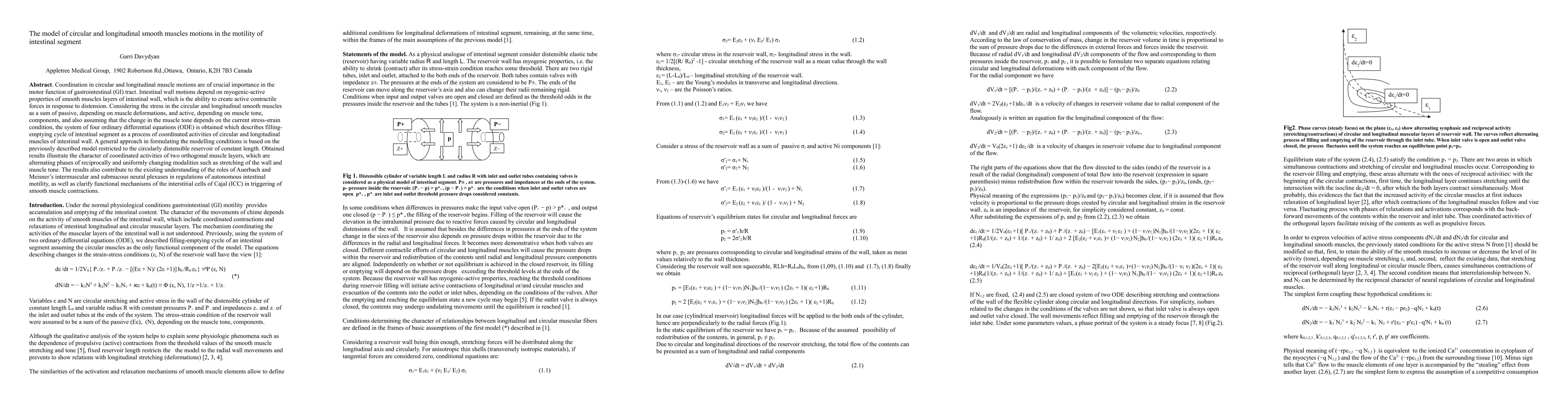 This paper models the coordinated motions of circular and longitudinal smooth muscles in the intestinal segment, using a system of ordinary differential equations to describe the filling-emptying cycle. The study emphasizes the importance of muscle tone and stress-strain conditions in regulating intestinal motility and provides insights into the roles of neural plexuses and interstitial cells of Cajal in smooth muscle contractions.