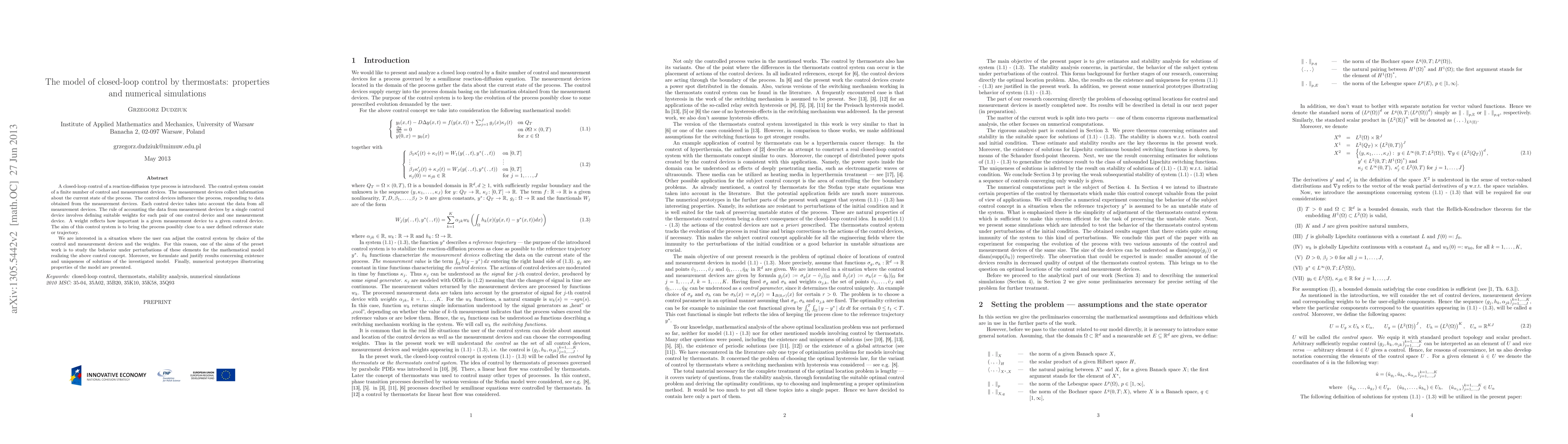 A closed-loop control of a reaction-diffusion type process is introduced. The control system consist of a finite number of control and measurement devices. The measurement devices collect information about the current state of the process. The control devices influence the process, responding to data obtained from the measurement devices. Each control device takes into account the data from all measurement devices. The rule of accounting the data from measurement devices by a single control device involves defining suitable weights for each pair of one control device and one measurement device. A weight reflects how important is a given measurement device to a given control device. The aim of this control system is to bring the process possibly close to a user defined reference state or trajectory. We are interested in a situation where the user can adjust the control system by choice of the control and measurement devices and the weights. For this reason, one of the aims of the preset work is to study the behavior under perturbations of these elements for the mathematical model realizing the above control concept. Moreover, we formulate and justify results concerning existence and uniqueness of solutions of the investigated model. Finally, numerical prototypes illustrating properties of the model are presented.