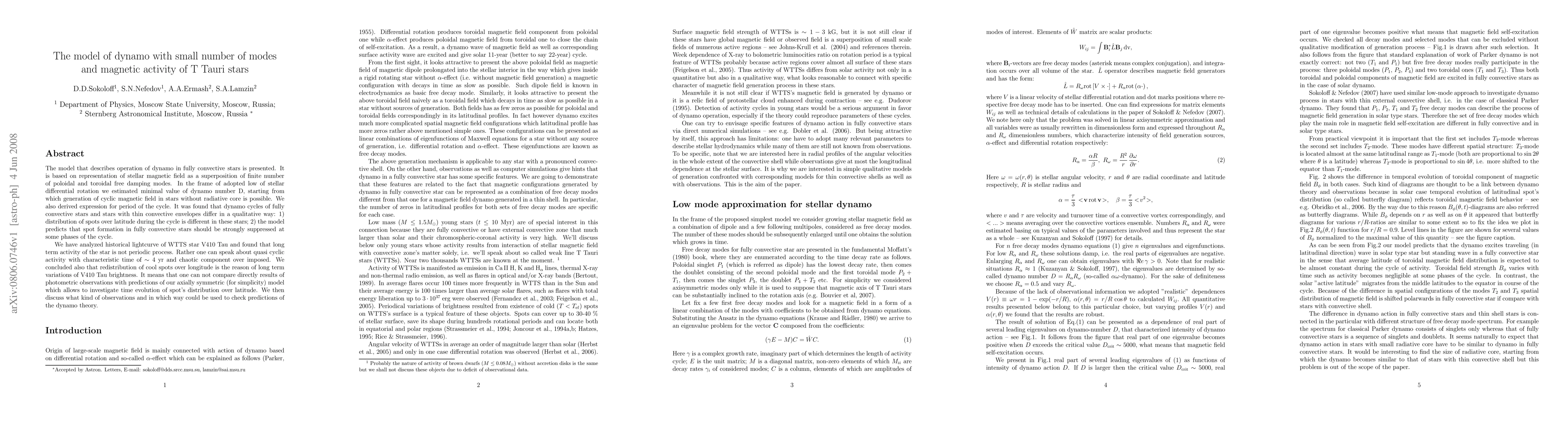 The model that describes operation of dynamo in fully convective stars is presented. It is based on representation of stellar magnetic field as a superposition of finite number of poloidal and toroidal free damping modes. In the frame of adopted low of stellar differential rotation we estimated minimal value of dynamo number D, starting from which generation of cyclic magnetic field in stars without radiative core is possible. We also derived expression for period of the cycle. It was found that dynamo cycles of fully convective stars and stars with thin convective envelopes differ in a qualitative way: 1) distribution of spots over latitude during the cycle is different in these stars; 2) the model predicts that spot formation in fully convective stars should be strongly suppressed at some phases of the cycle. We have analyzed historical lightcurve of WTTS star V410 Tau and found that long term activity of the star is not periodic process. Rather one can speak about quasi cyclic activity with characteristic time of $\sim 4$ yr and chaotic component over imposed. We concluded also that redistribution of cool spots over longitude is the reason of long term variations of V410 Tau brightness. It means that one can not compare directly results of photometric observations with predictions of our axially symmetric (for simplicity) model which allows to investigate time evolution of spot's distribution over latitude. We then discuss what kind of observations and in which way could be used to check predictions of the dynamo theory.