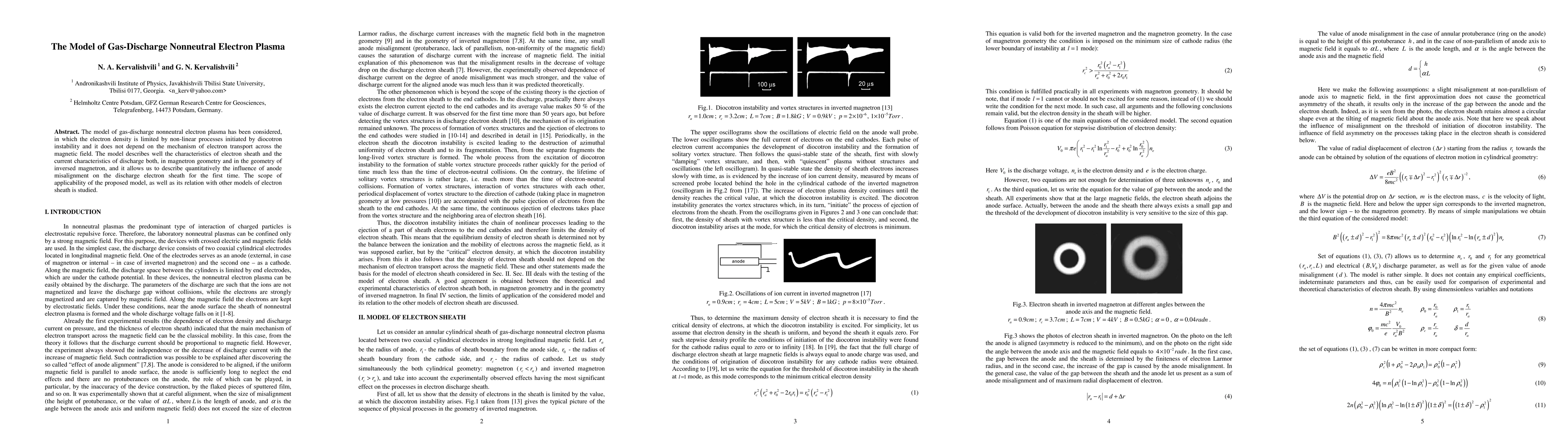 The model of gas-discharge nonneutral electron plasma has been considered, in which the electron density is limited by non-linear processes initiated by diocotron instability and it does not depend on the mechanism of electron transport across the magnetic field. The model describes well the characteristics of electron sheath and the current characteristics of discharge both, in magnetron geometry and in the geometry of inversed magnetron, and it allows us to describe quantitatively the influence of anode misalignment on the discharge electron sheath for the first time. The scope of applicability of the proposed model, as well as its relation with other models of electron sheath is studied.