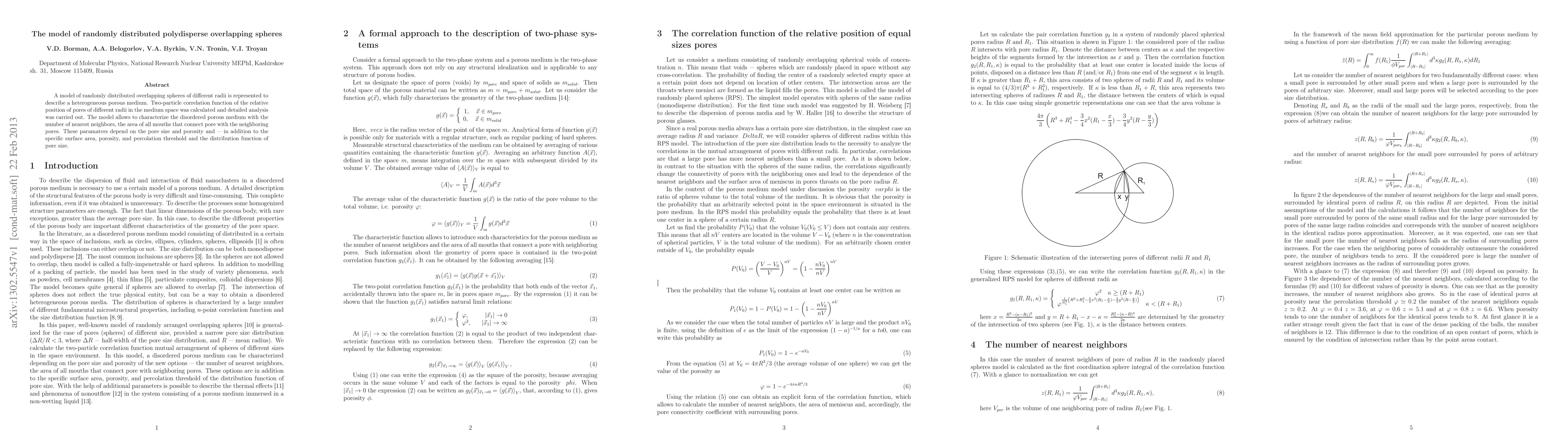 A model of randomly distributed overlapping spheres of different radii is represented to describe a heterogeneous porous medium. Two-particle correlation function of the relative position of pores of different radii in the medium space was calculated and detailed analysis was carried out. The model allows to characterize the disordered porous medium with the number of nearest neighbors, the area of all mouths that connect pore with the neighboring pores. These paramaters depend on the pore size and porosity and --- in addition to the specific surface area, porosity, and percolation threshold and the distribution function of pore size.