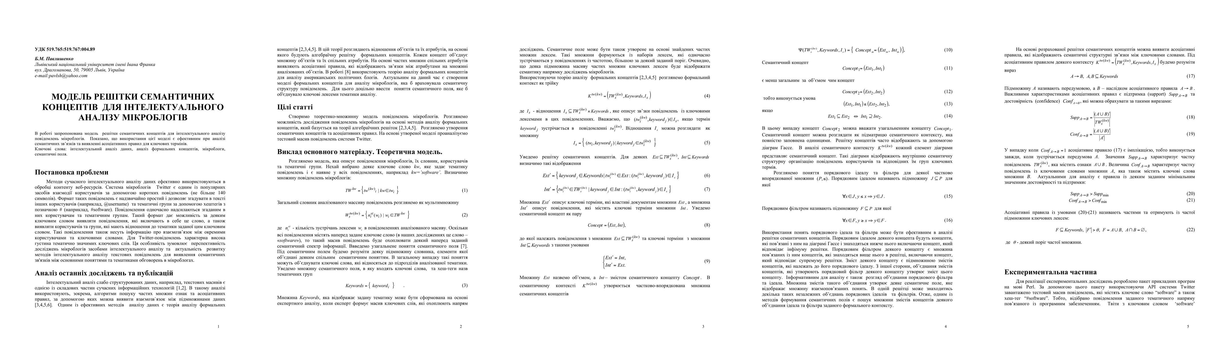 The model of semantic concept lattice for data mining of microblogs has been proposed in this work. It is shown that the use of this model is effective for the semantic relations analysis and for the detection of associative rules of key words.