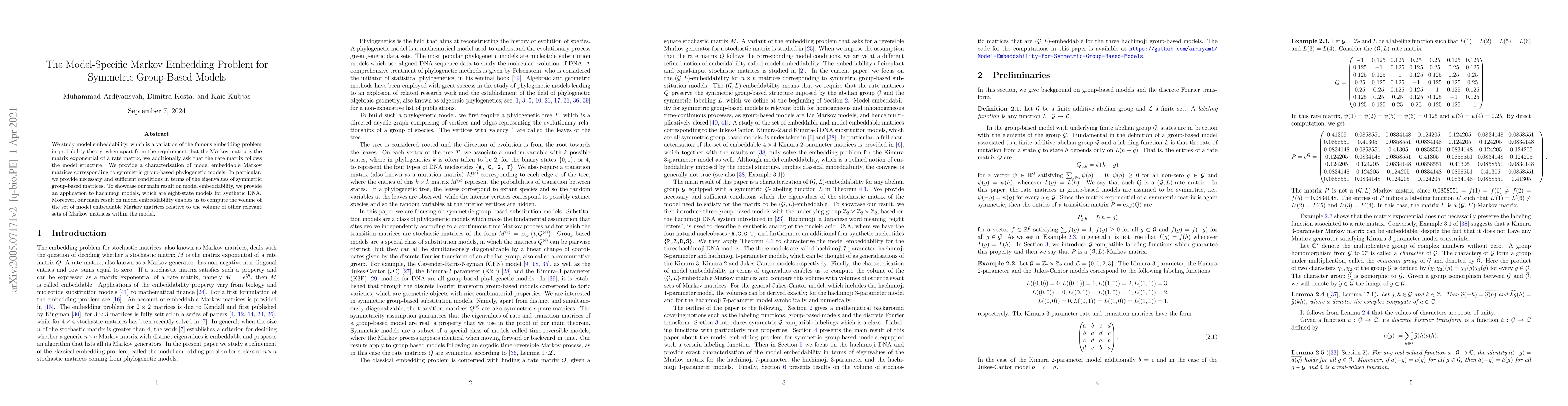 We study model embeddability, which is a variation of the famous embedding problem in probability theory, when apart from the requirement that the Markov matrix is the matrix exponential of a rate matrix, we additionally ask that the rate matrix follows the model structure. We provide a characterisation of model embeddable Markov matrices corresponding to symmetric group-based phylogenetic models. In particular, we provide necessary and sufficient conditions in terms of the eigenvalues of symmetric group-based matrices. To showcase our main result on model embeddability, we provide an application to hachimoji models, which are eight-state models for synthetic DNA. Moreover, our main result on model embeddability enables us to compute the volume of the set of model embeddable Markov matrices relative to the volume of other relevant sets of Markov matrices within the model.