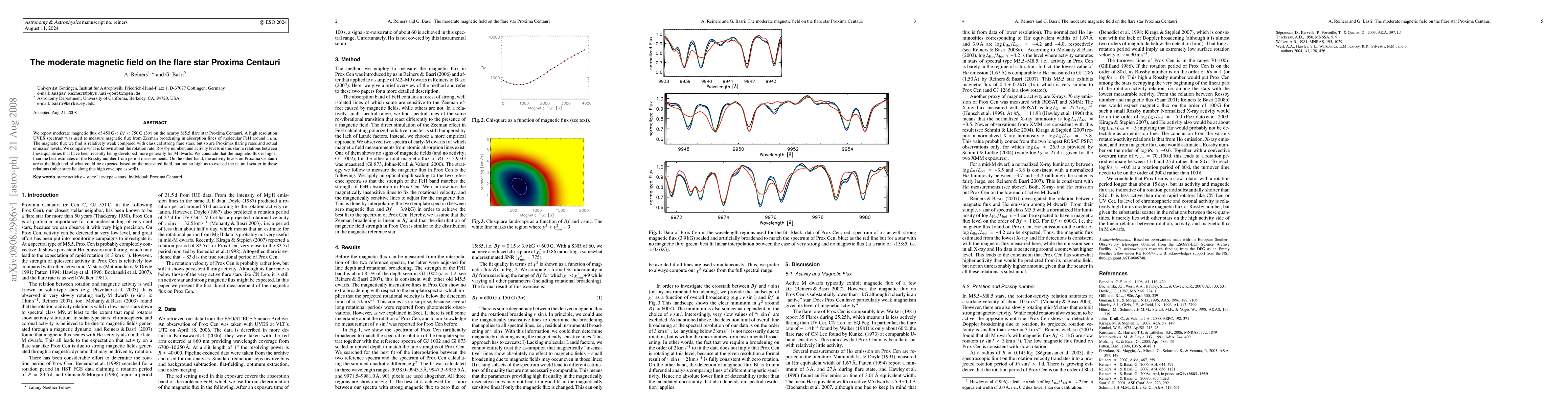 This paper reports a moderate magnetic flux of 450G < Bf < 750G on Proxima Centauri, an M5.5 flare star, using high-resolution spectroscopy. The magnetic flux is relatively weak compared to other strong flare stars, aligning with the star's low flaring rates and emission levels.