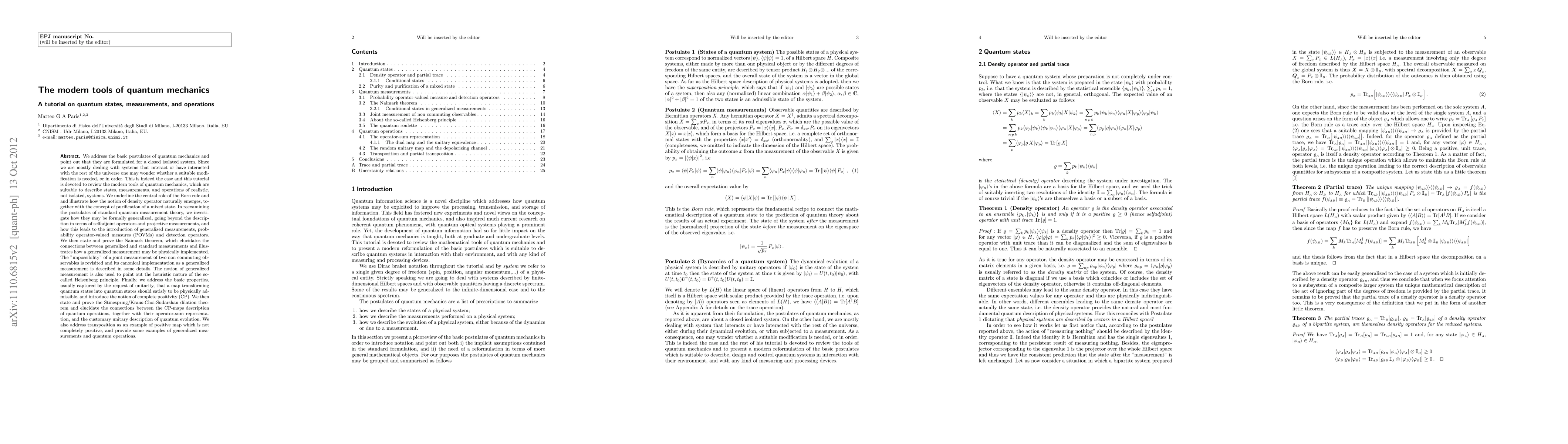 This tutorial is devoted to review the modern tools of quantum mechanics, which are suitable to describe states, measurements, and operations of realistic, not isolated, systems in interaction with their environment, and with any kind of measuring and processing devices. We underline the central role of the Born rule and and illustrate how the notion of density operator naturally emerges, together the concept of purification of a mixed state. In reexamining the postulates of standard quantum measurement theory, we investigate how they may formally generalized, going beyond the description in terms of selfadjoint operators and projective measurements, and how this leads to the introduction of generalized measurements, probability operator-valued measures (POVM) and detection operators. We then state and prove the Naimark theorem, which elucidates the connections between generalized and standard measurements and illustrates how a generalized measurement may be physically implemented. The "impossibility" of a joint measurement of two non commuting observables is revisited and its canonical implementations as a generalized measurement is described in some details. Finally, we address the basic properties, usually captured by the request of unitarity, that a map transforming quantum states into quantum states should satisfy to be physically admissible, and introduce the notion of complete positivity (CP). We then state and prove the Stinespring/Kraus-Choi-Sudarshan dilation theorem and elucidate the connections between the CP-maps description of quantum operations, together with their operator-sum representation, and the customary unitary description of quantum evolution. We also address transposition as an example of positive map which is not completely positive, and provide some examples of generalized measurements and quantum operations.