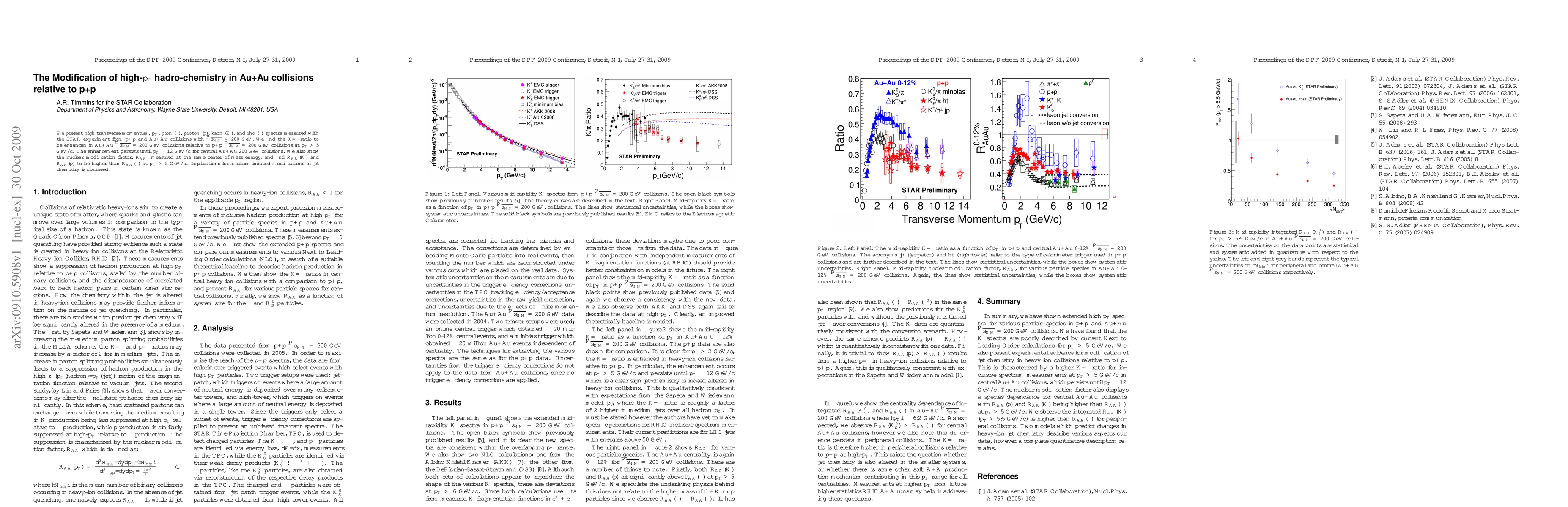 We present high transverse momentum, $p_{T}$, pion ($\pi$), proton ($p$), kaon ($K$), and rho ($\rho$) spectra measured with the STAR experiment from p+p and Au+Au collisions with \sNN{200}. We find the $K/\pi$ ratio to be enhanced in Au+Au \sNN{200} collisions relative to p+p \sNN{200} collisions at $p_{T} > 5$ GeV/c. The enhancement persists until $p_{T} \sim 12$ GeV/c for central Au+Au 200 GeV collisions. We also show the nuclear modification factor, $R_{AA}$, measured at the same center of mass energy, and find $R_{AA}(K)$ and $R_{AA}(p)$ to be higher than $R_{AA}(\pi)$ at $p_T > 5$ GeV/c. Implications for medium induced modifications of jet chemistry is discussed.