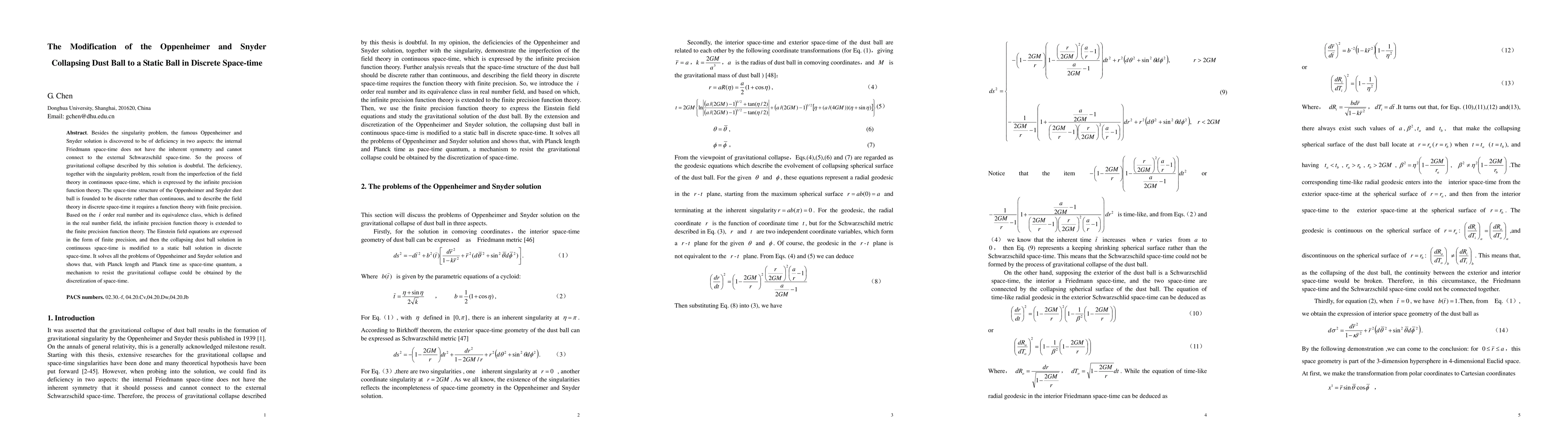 Besides the singularity problem, the famous Oppenheimer and Snyder solution is discovered to be of deficiency in two aspects: the internal Friedmann space-time does not have the inherent symmetry and cannot connect to the external Schwarzschild space-time. So the process of gravitational collapse described by this solution is doubtful. The deficiency, together with the singularity problem, result from the imperfection of the field theory in continuous space-time, which is expressed by the infinite precision function theory. The space-time structure of the Oppenheimer and Snyder dust ball is founded to be discrete rather than continuous, and to describe the field theory in discrete space-time it requires a function theory with finite precision. Based on the i order real number and its equivalence class, which is defined in the real number field, the infinite precision function theory is extended to the finite precision function theory. The Einstein field equations are expressed in the form of finite precision, and then the collapsing dust ball solution in continuous space-time is modified to a static ball solution in discrete space-time. It solves all the problems of Oppenheimer and Snyder solution and shows that, with Planck length and Planck time as space-time quantum, a mechanism to resist the gravitational collapse could be obtained by the discretization of space-time.