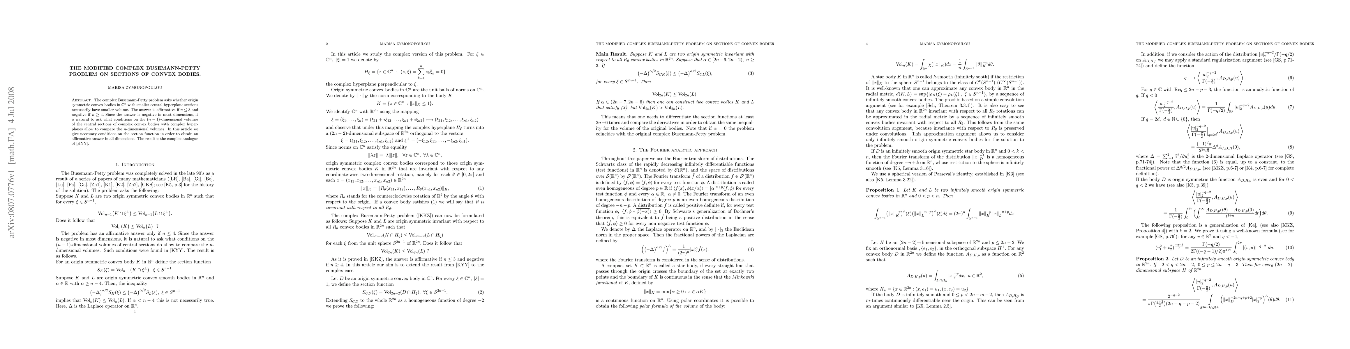 This paper explores the modified complex Busemann-Petty problem concerning the comparison of n-dimensional volumes of convex bodies based on their (n-1)-dimensional central sections. It provides necessary conditions on the section function to ensure an affirmative answer in all dimensions.