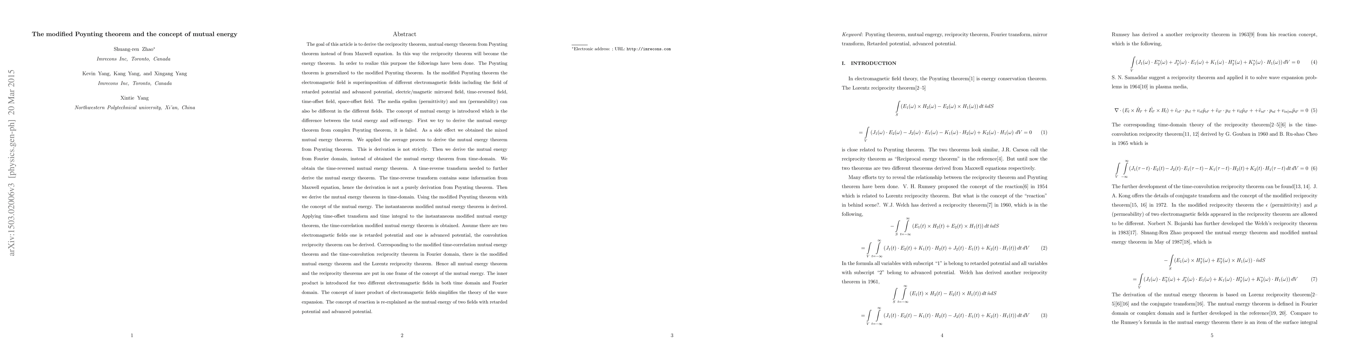 This paper derives the reciprocity theorem and mutual energy theorem from the modified Poynting theorem, introducing the concept of mutual energy as the difference between total and self-energy. It also establishes new complementary theorems and introduces the inner product for different electromagnetic fields in both time and Fourier domains.