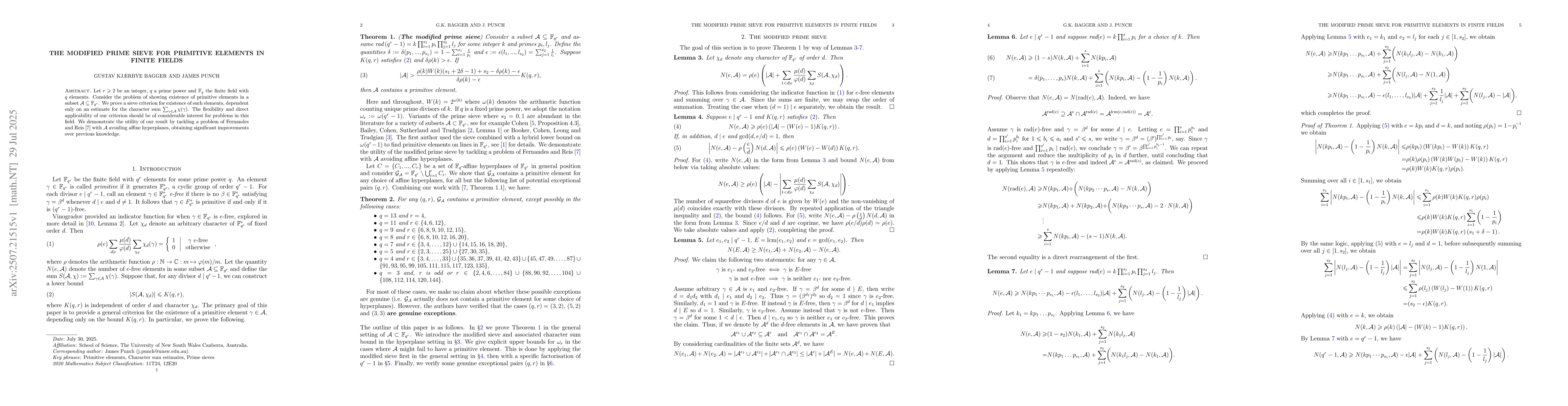 The paper presents a modified prime sieve criterion for the existence of primitive elements in subsets of finite fields, utilizing an estimate for character sums over these subsets.