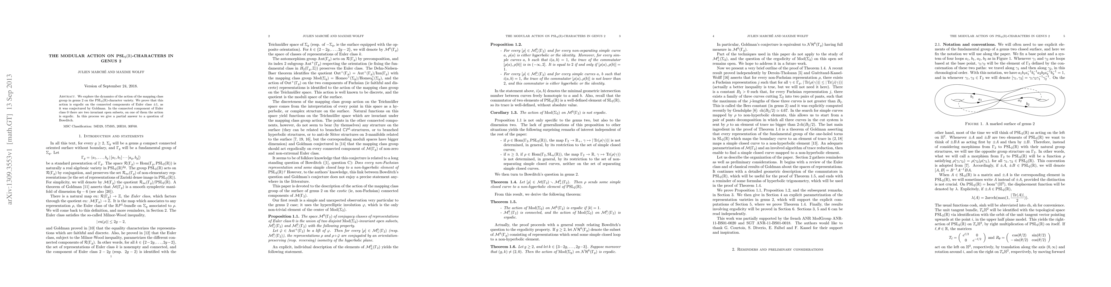 This paper explores how the mapping class group acts on PSL(2,R)-characters in genus 2, proving ergodicity in certain connected components and giving a partial answer to Bowditch's question about invariant subsets.