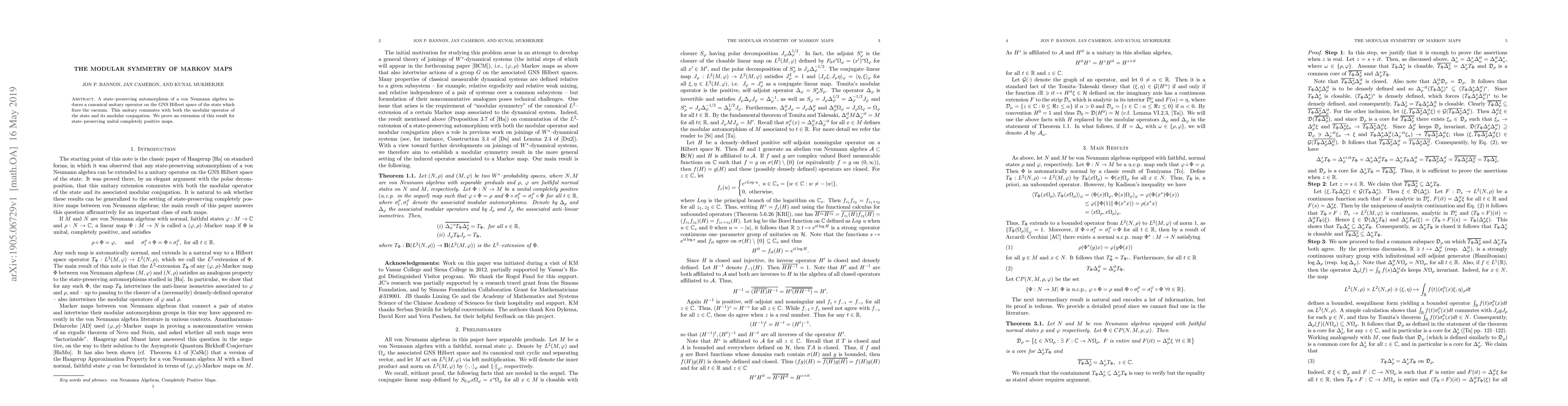 Summary: The paper proves that state-preserving unital completely positive maps induce a unitary operator on the GNS Hilbert space that commutes with the modular operator and its conjugation, extending the known result for automorphisms. This establishes a modular symmetry for Markov maps.