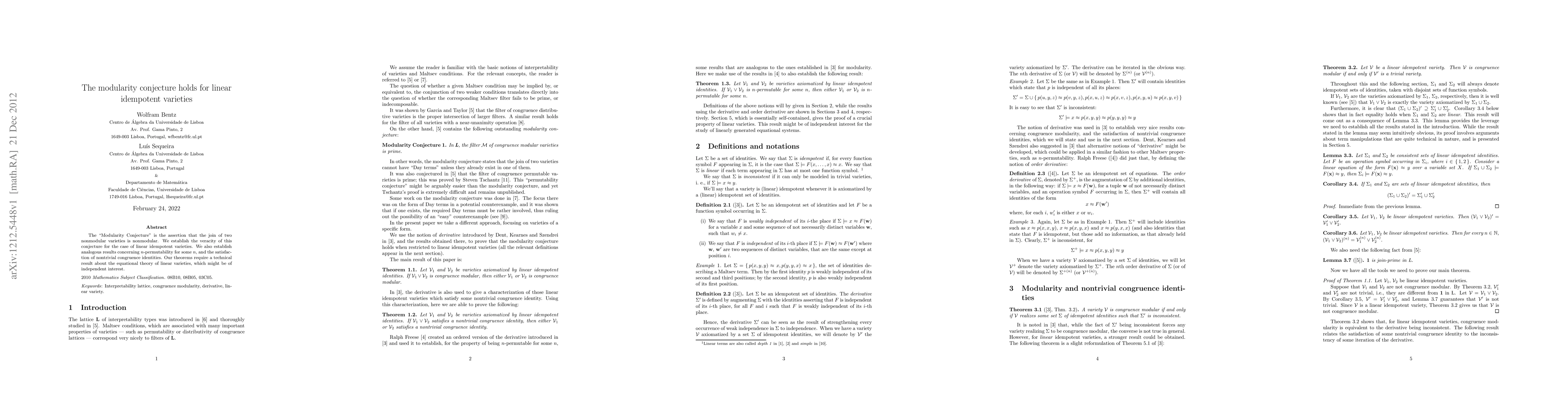 The Modularity Conjecture is confirmed for linear idempotent varieties, demonstrating that the join of two nonmodular varieties remains nonmodular. Additionally, the study supports analogous results regarding $n$-permutability and nontrivial congruence identities.