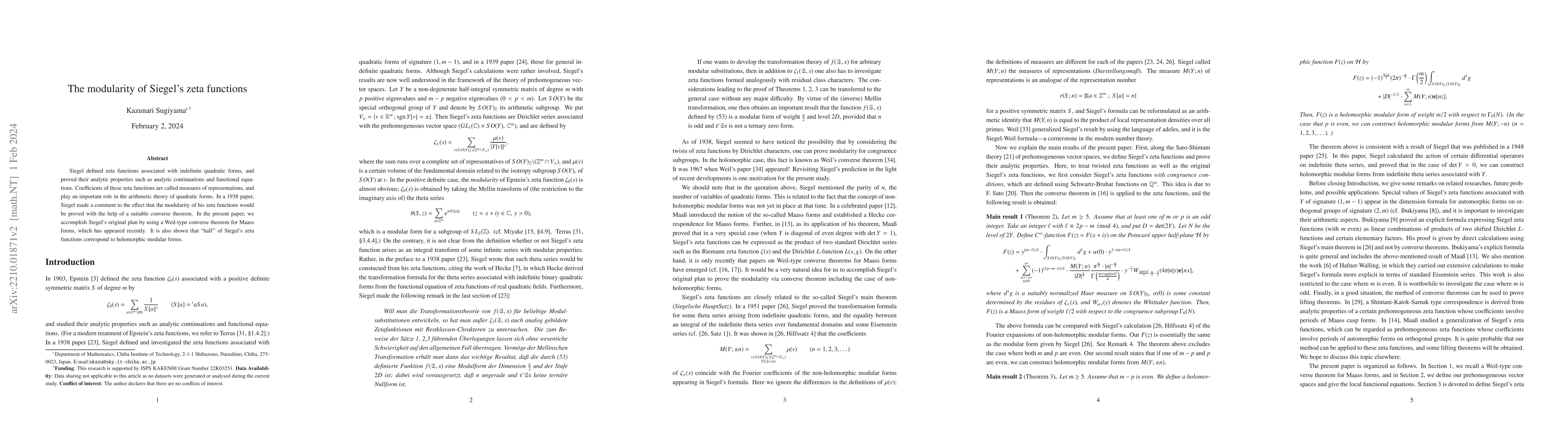 This paper proves the modularity of Siegel's zeta functions associated with indefinite quadratic forms, utilizing a recent Weil-type converse theorem for Maass forms. It demonstrates that half of these zeta functions correspond to holomorphic modular forms.