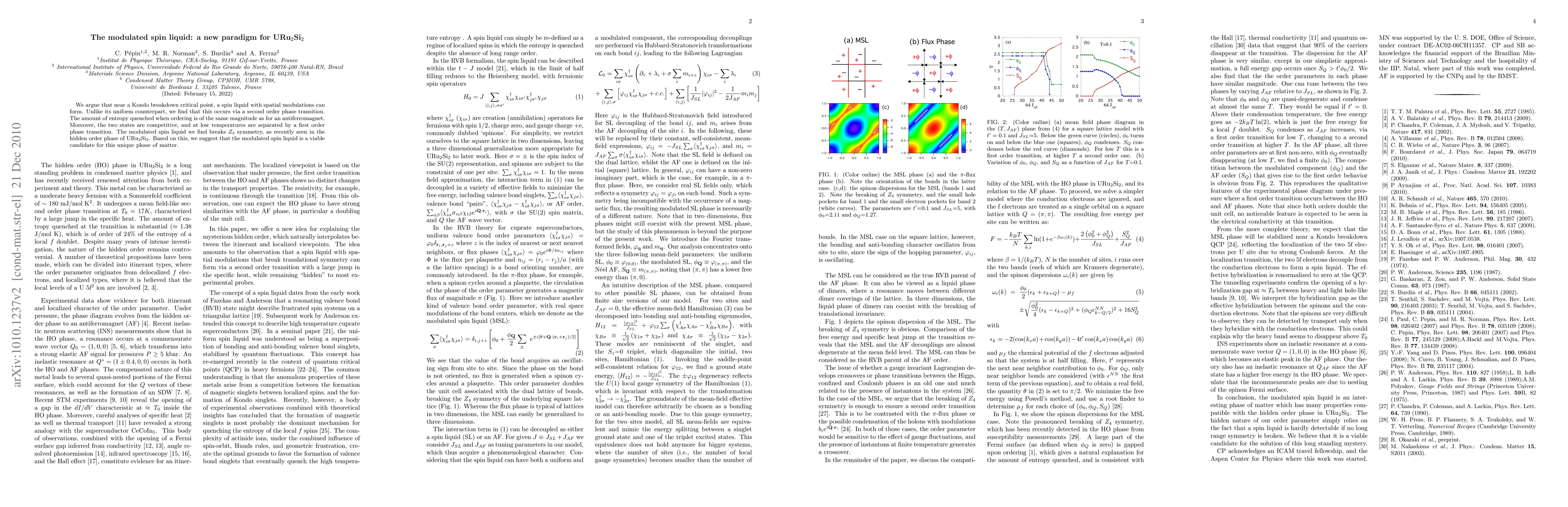 We argue that near a Kondo breakdown critical point, a spin liquid with spatial modulations can form. Unlike its uniform counterpart, we find that this occurs via a second order phase transition. The amount of entropy quenched when ordering is of the same magnitude as for an antiferromagnet. Moreover, the two states are competitive, and at low temperatures are separated by a first order phase transition. The modulated spin liquid we find breaks $Z_4$ symmetry, as recently seen in the hidden order phase of URu$_2$Si$_2$. Based on this, we suggest that the modulated spin liquid is a viable candidate for this unique phase of matter.