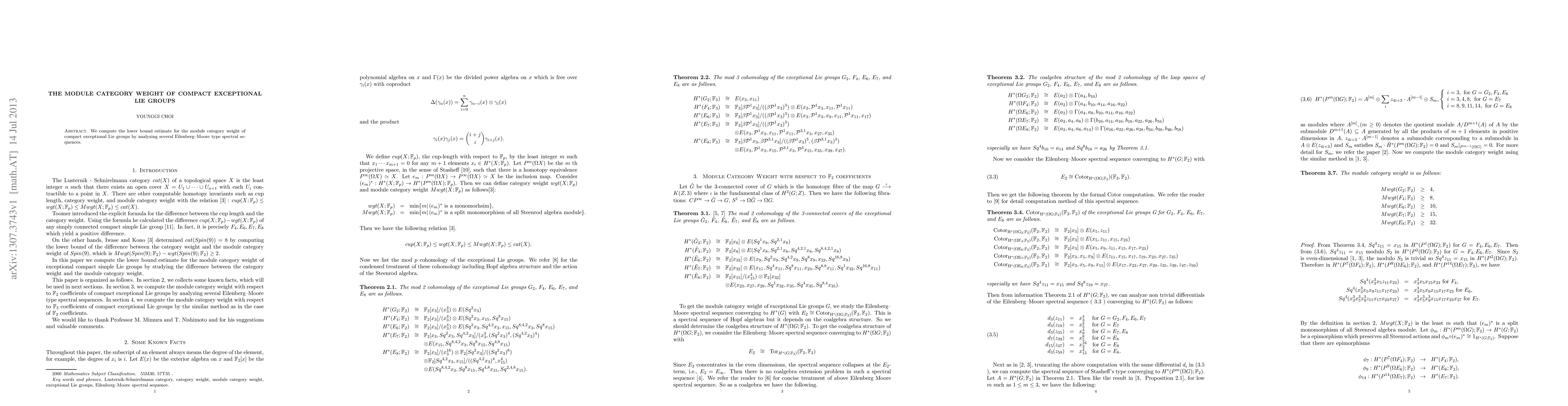 Summary: This paper computes a lower bound estimate for the module category weight of compact exceptional Lie groups using Eilenberg-Moore type spectral sequences, providing insights into their module structure.