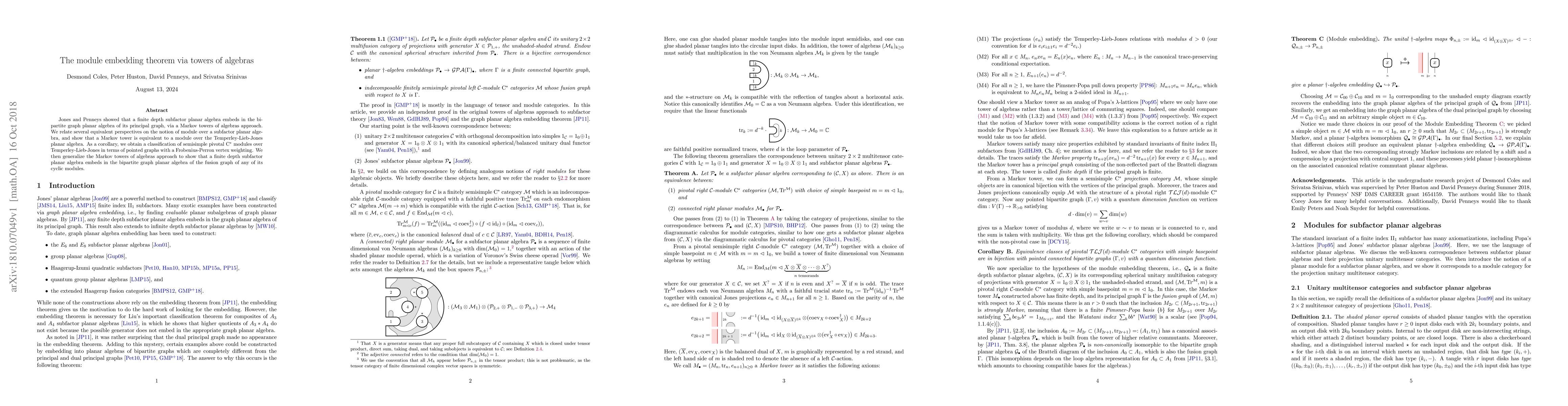 This research paper shows that a finite depth subfactor planar algebra can be embedded in the bipartite graph planar algebra of its principal graph through Markov towers of algebras, providing a classification of semisimple pivotal C* modules over Temperley-Lieb-Jones.