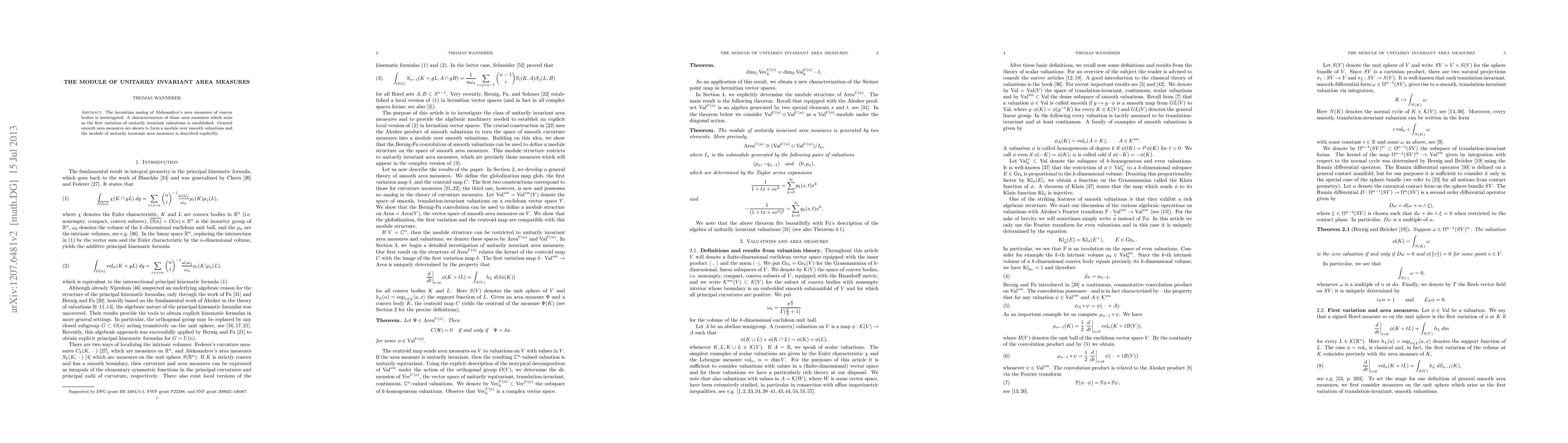 This paper investigates hermitian analogs of Aleksandrov's area measures for convex bodies, characterizing those arising as the first variation of unitarily invariant valuations. It also describes the module structure of general smooth area measures and explicitly defines the module of unitarily invariant area measures.