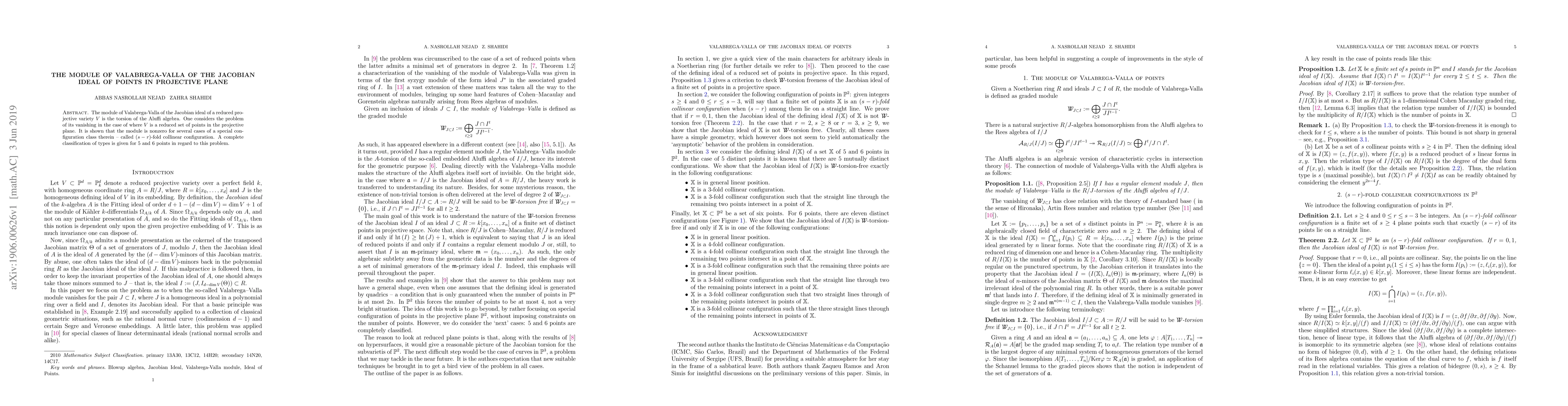 The paper investigates the Valabrega-Valla module of the Jacobian ideal for a reduced projective variety, focusing on its vanishing when $V$ is a set of points in the projective plane. It demonstrates that the module is nonzero for specific $(s-r)$-fold collinear configurations, and provides a complete classification for $5$ and $6$ points.