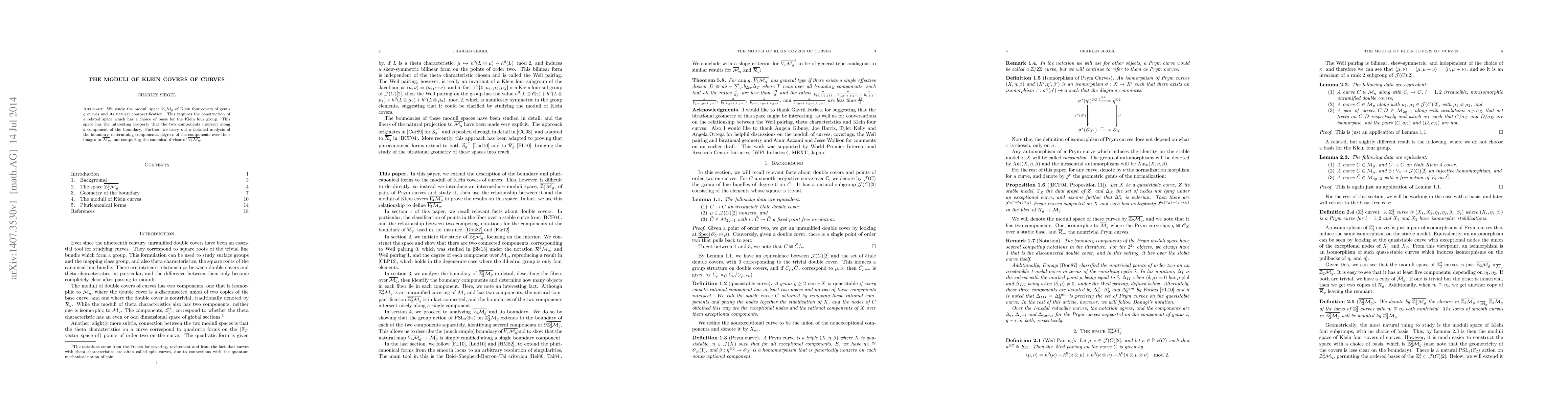 This paper investigates the moduli space of Klein four covers of genus $g$ curves and its compactification, focusing on the intersection properties of components in the boundary and calculating the canonical divisor. It also constructs a related space that facilitates understanding the structure of the moduli space.