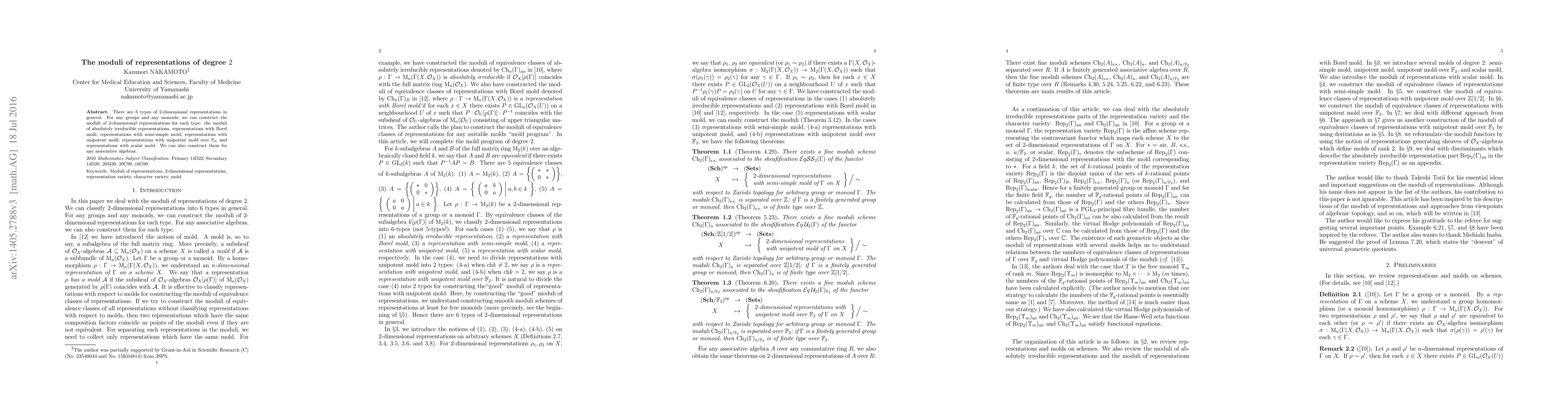 There are 6 types of 2-dimensional representations in general. For any groups and any monoids, we can construct the moduli of 2-dimensional representations for each type: the moduli of absolutely irreducible representations, representations with Borel mold, representations with semi-simple mold, representations with unipotent mold, representations with unipotent mold over ${\Bbb F}_2$, and representations with scalar mold. We can also construct them for any associative algebras.