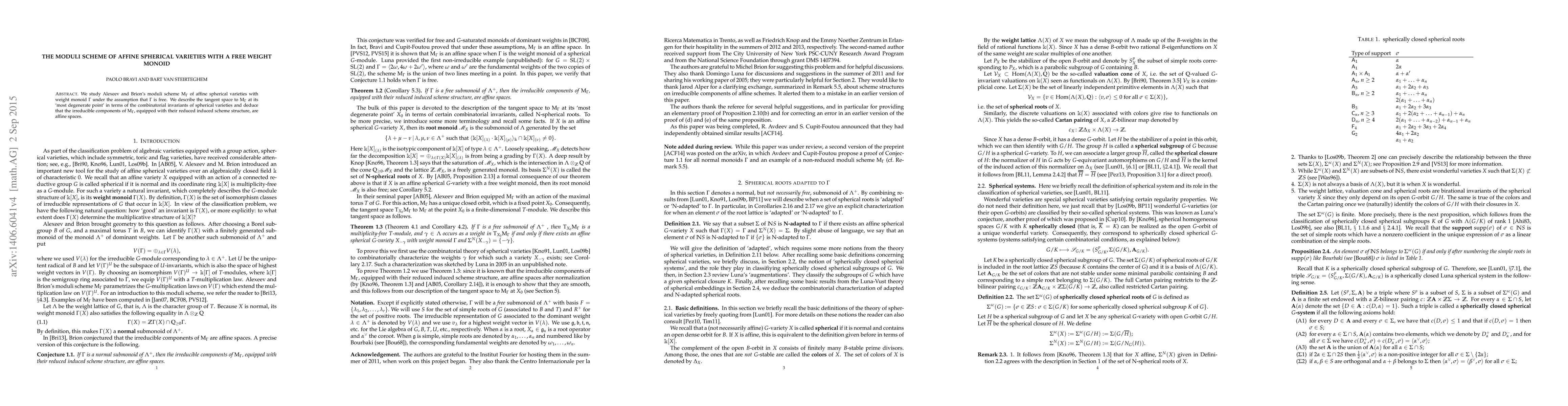 This paper investigates the moduli scheme $M_\Gamma$ of affine spherical varieties with a free weight monoid $\Gamma$, describing its tangent space at the most degenerate point and concluding that its irreducible components are affine spaces.