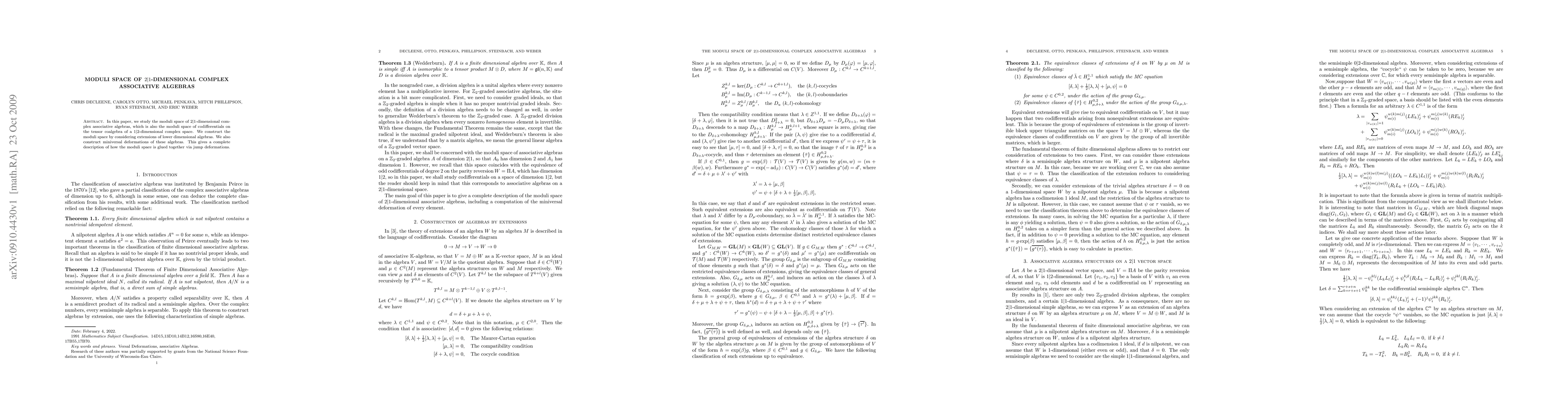 This paper constructs the moduli space of $2|1$-dimensional complex associative algebras, exploring extensions of lower-dimensional algebras and providing miniversal deformations, which elucidates the structure and connections within the moduli space.