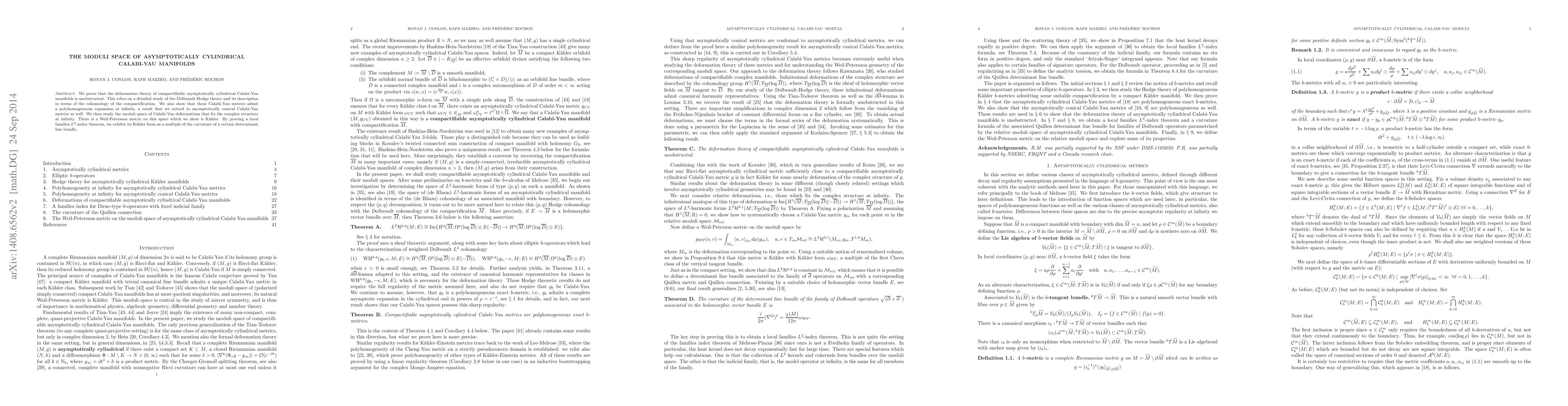 The paper proves the unobstructed deformation theory of compactifiable asymptotically cylindrical Calabi-Yau manifolds and describes their moduli space, showing the presence of a Kähler Weil-Petersson metric and its relation to the curvature of a determinant line bundle. The study extends to asymptotically conical Calabi-Yau metrics with polyhomogeneous expansions at infinity.
