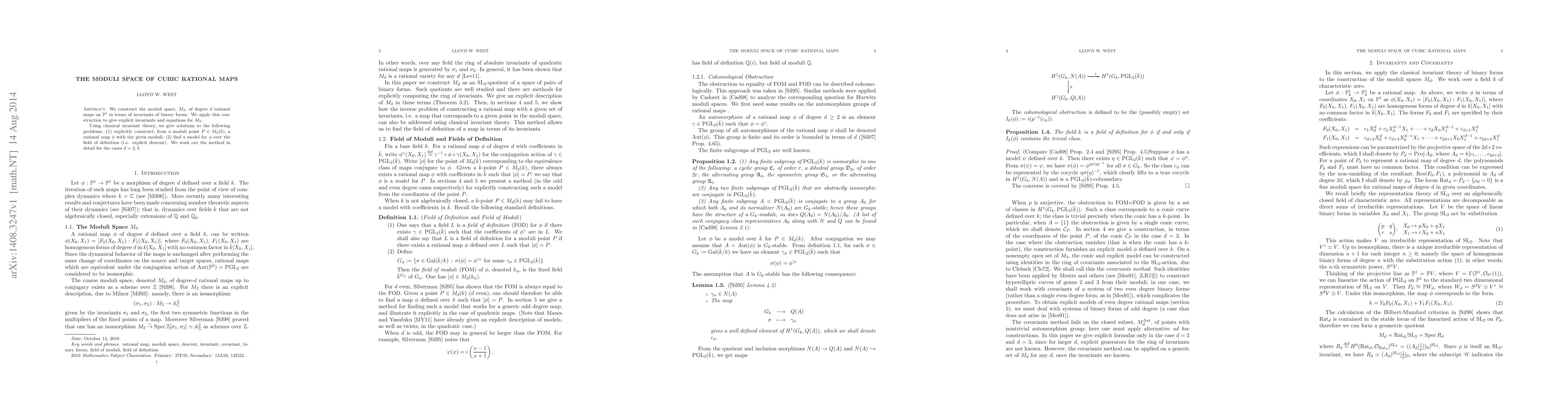 This paper constructs the moduli space $M_d$ of degree $d$ rational maps on $\mathbb{P}^1$ using binary forms and applies this to $M_3$ to provide explicit invariants and equations. It solves problems of constructing rational maps and finding their models over the field of definition, focusing on $d=2,3$.